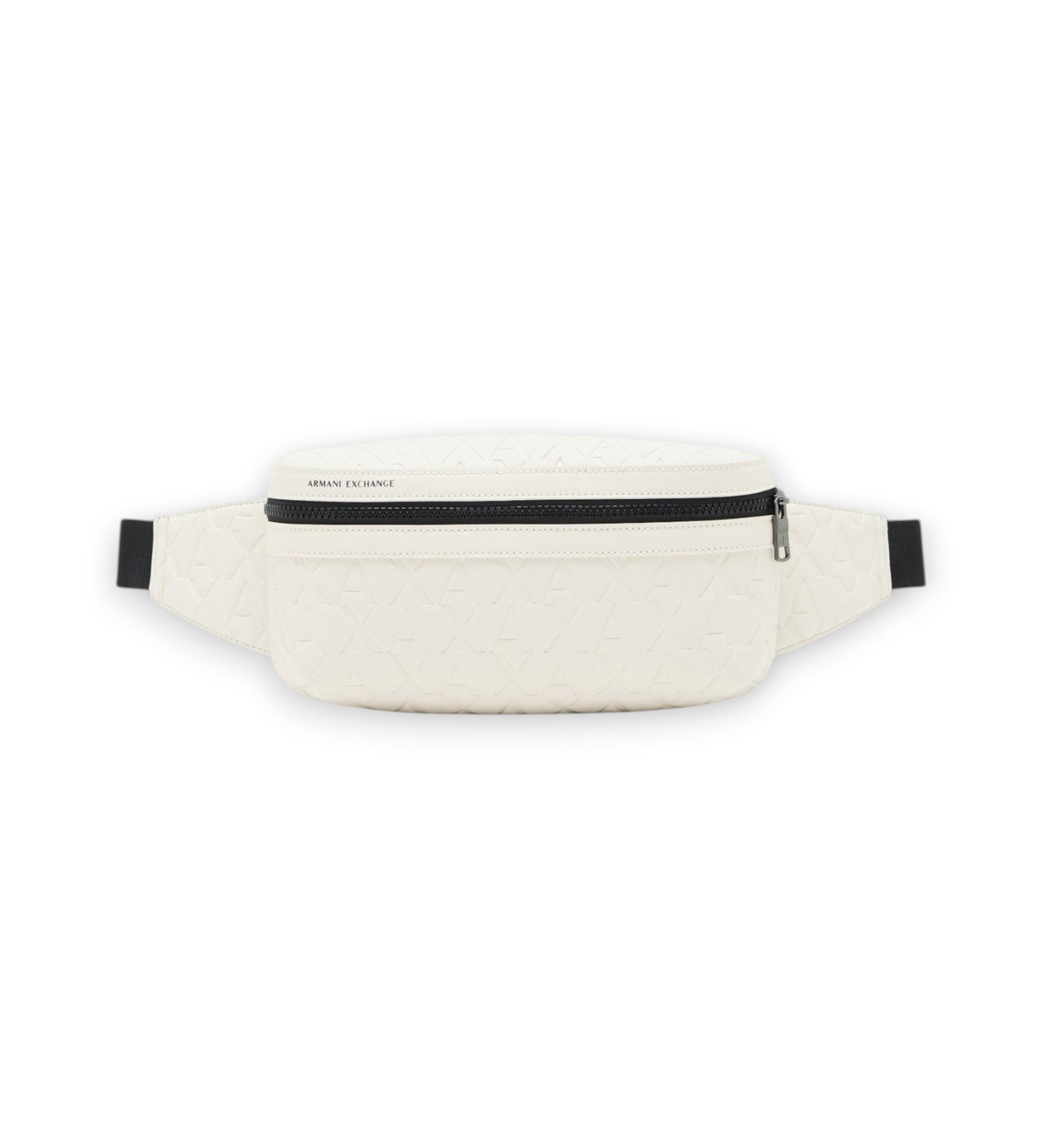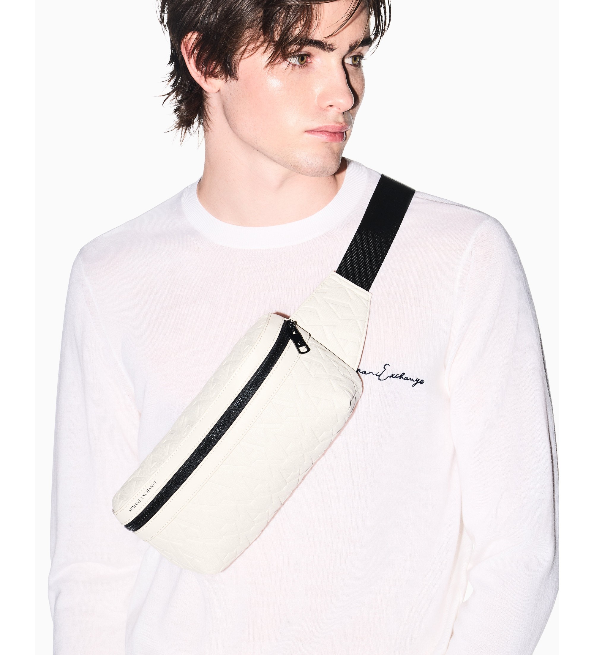 Bolsa de cintura para homem com um logótipo que percorre toda a superfície e confere textura. Confeccionada em 100% poliéster, apresenta detalhes em couro sintético nos reforços e uma moldura em cor contrastante à volta do logótipo, um gesto distinto mas discreto que define a sua estética. A cor creme realça o seu carácter contemporâneo, resultando num acessório com sensibilidade estética e presença refinada.