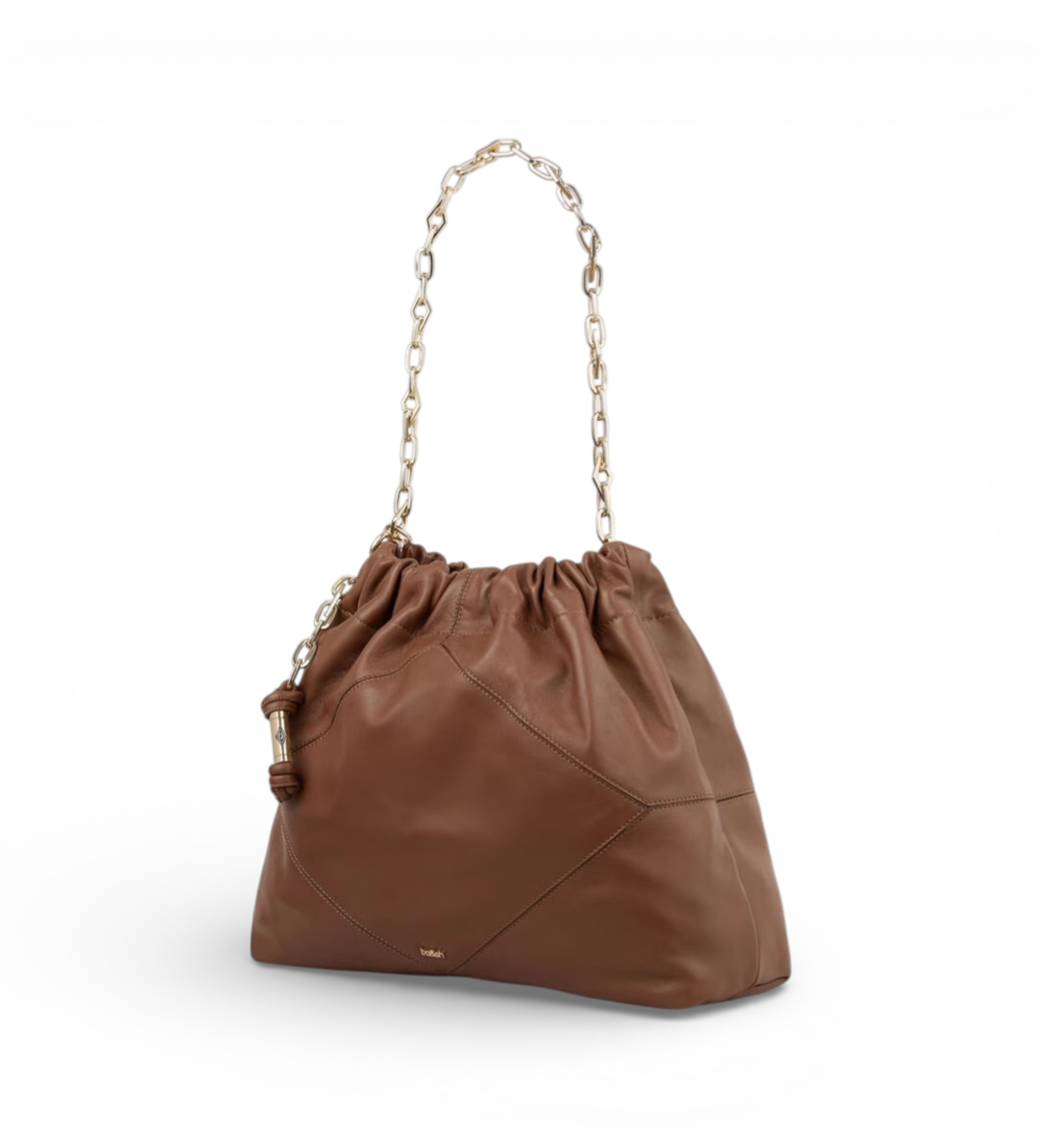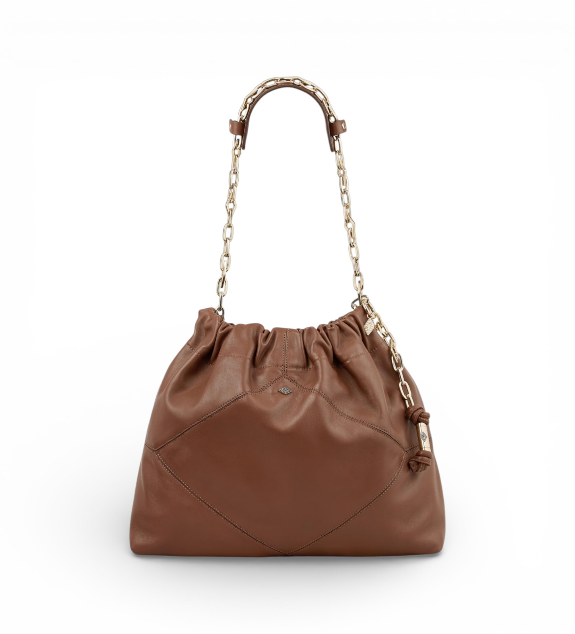 - Corrente de elos com assinatura e alça de ombro reforçada em pele