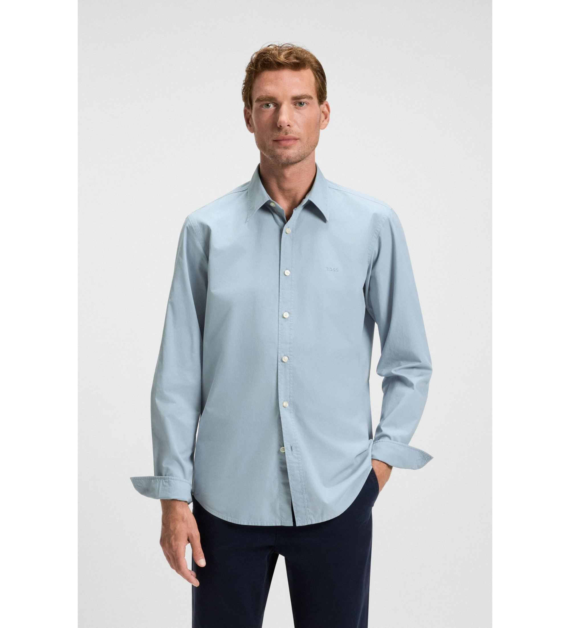 Actualize os seus básicos com esta camisa BOSS Menswear em popeline de algodão macio com um logótipo subtil bordado. Design casual de ajuste regular.