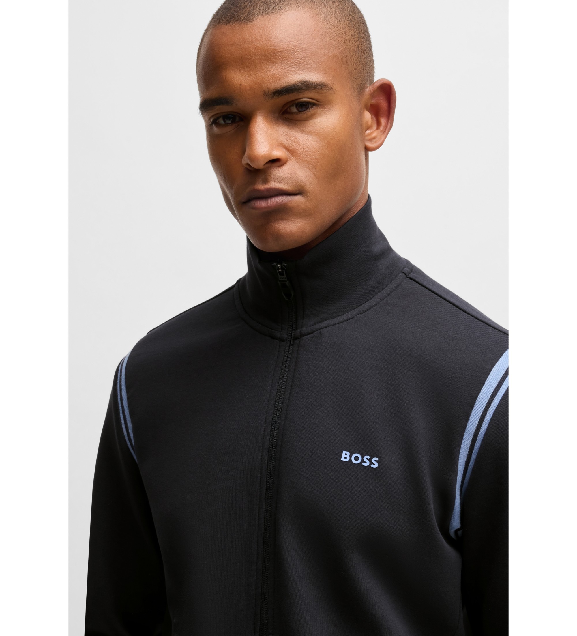Um fato de treino distinto da BOSS Menswear com detalhes da marca e aplicações às riscas. Este conjunto é confeccionado em algodão com elasticidade para facilitar os movimentos em todas as direcções. O fato de treino para desporto é apresentado como um conjunto de duas peças.