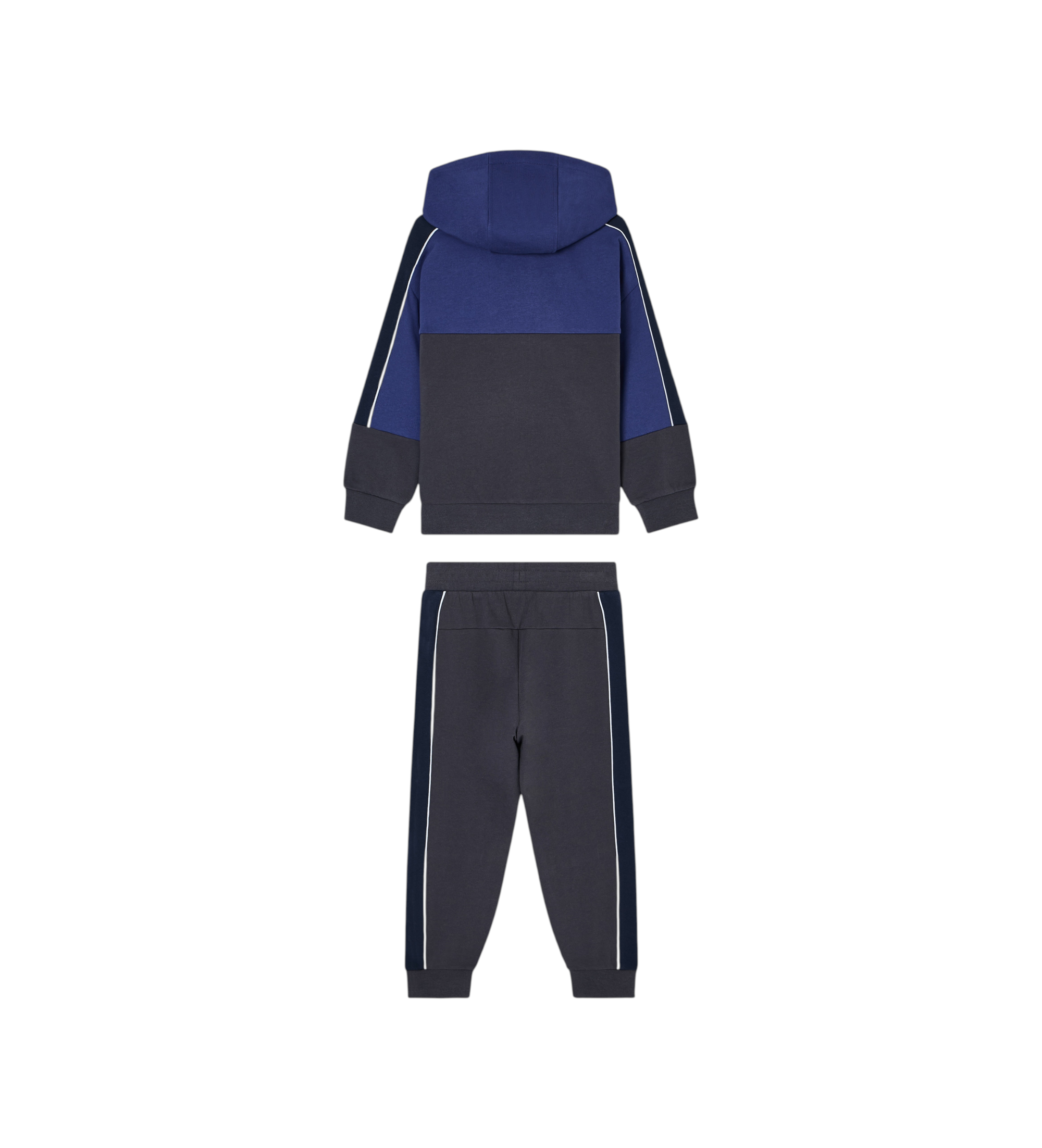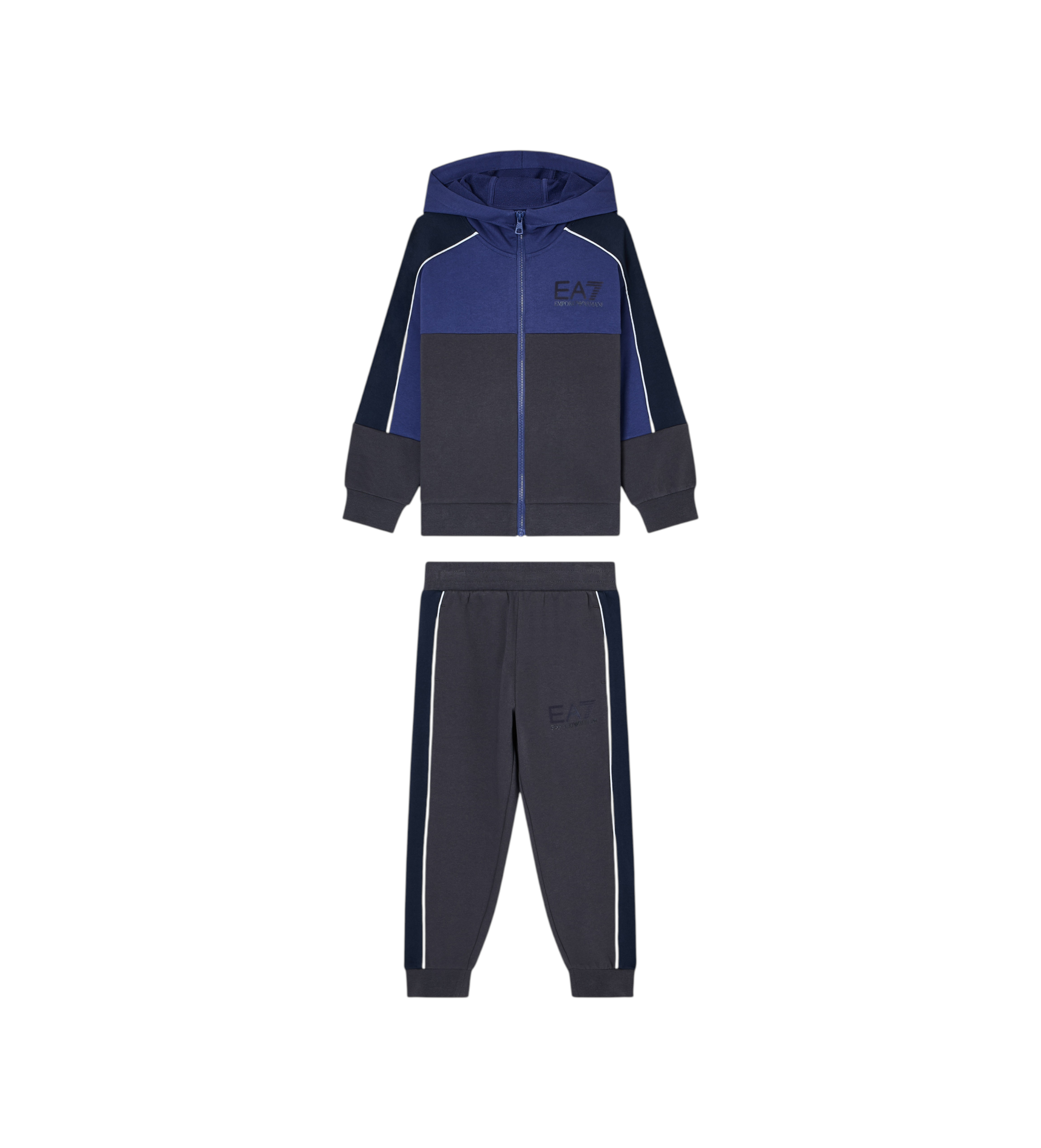 Fato de treino em mistura suave de algodão orgânico, composto por uma camisola com capuz tipo cardigan e calças confortáveis com cordões. O modelo é decorado com o logótipo EA7, que personaliza as calças e a camisola, e com o efeito de bloco de cores que partilha com outras propostas da linha Athletic Colour Block. Perfeito para brincar, praticar desporto ou relaxar.