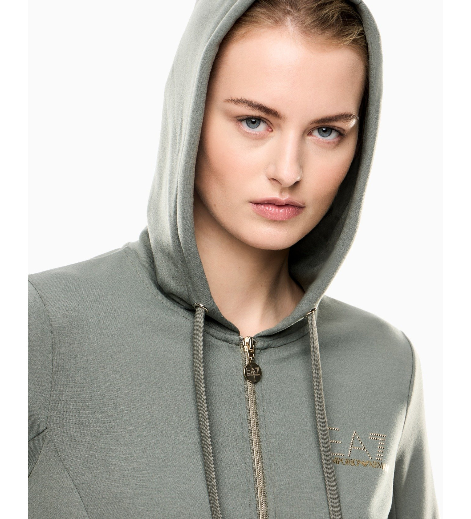 Fato de treino de design minimalista e ajuste confortável em malha de viscose elástica. Modelo composto por uma sweatshirt com capuz decorada com o logótipo EA7 com micro tachas douradas e calças de corte sóbrio, com o logótipo EA7 também feito com micro tachas douradas, que dão um toque luminoso. Uma peça de vestuário perfeita para o desporto e os tempos livres.