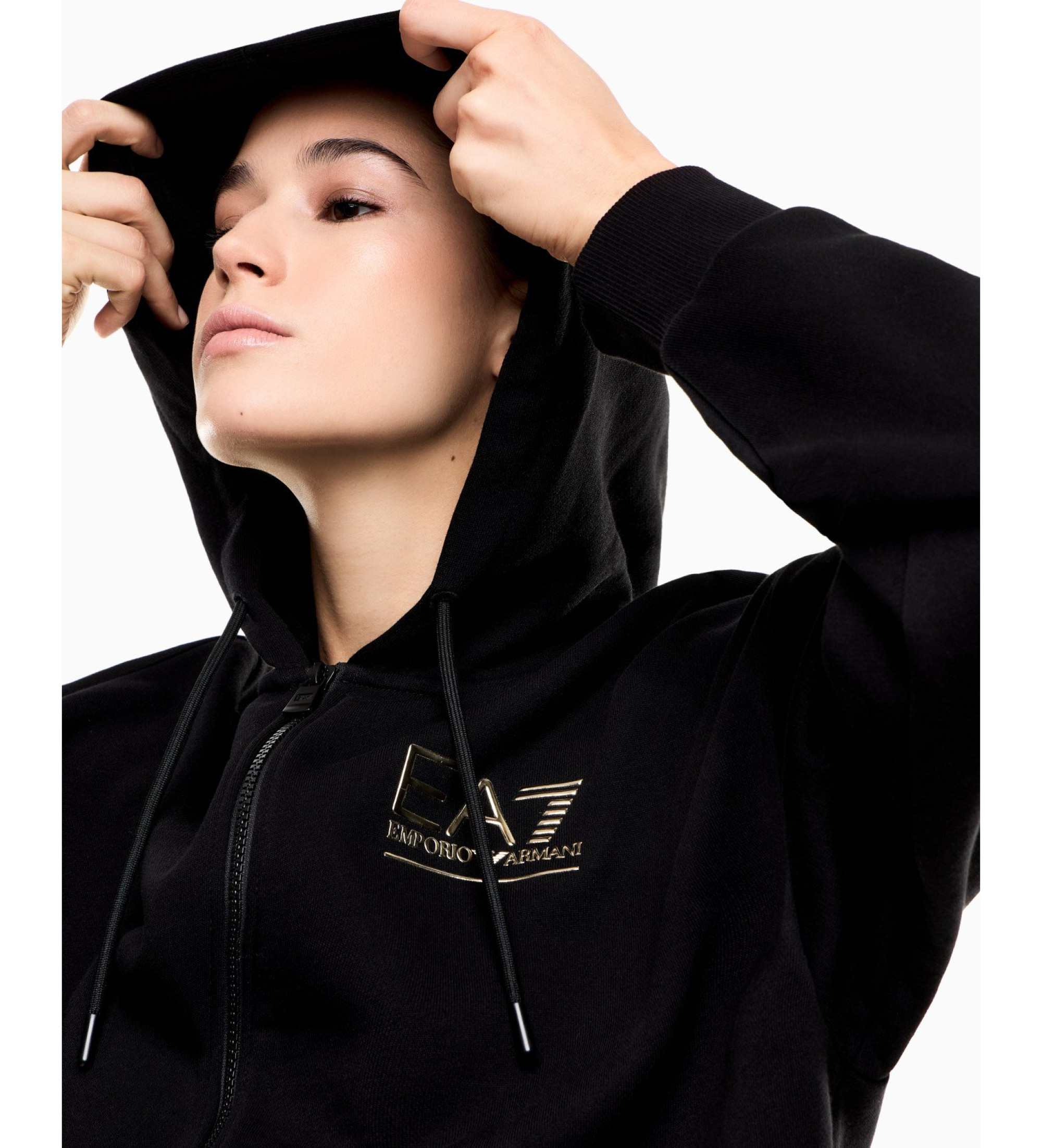 Fato de treino essencial e confortável, composto por uma camisola com capuz com cordão e fecho de correr e calças com cordão e bolsos laterais. Confeccionados em mistura de algodão e personalizados com um logótipo EA7 contrastante que confere às duas peças um estilo instantaneamente reconhecível.