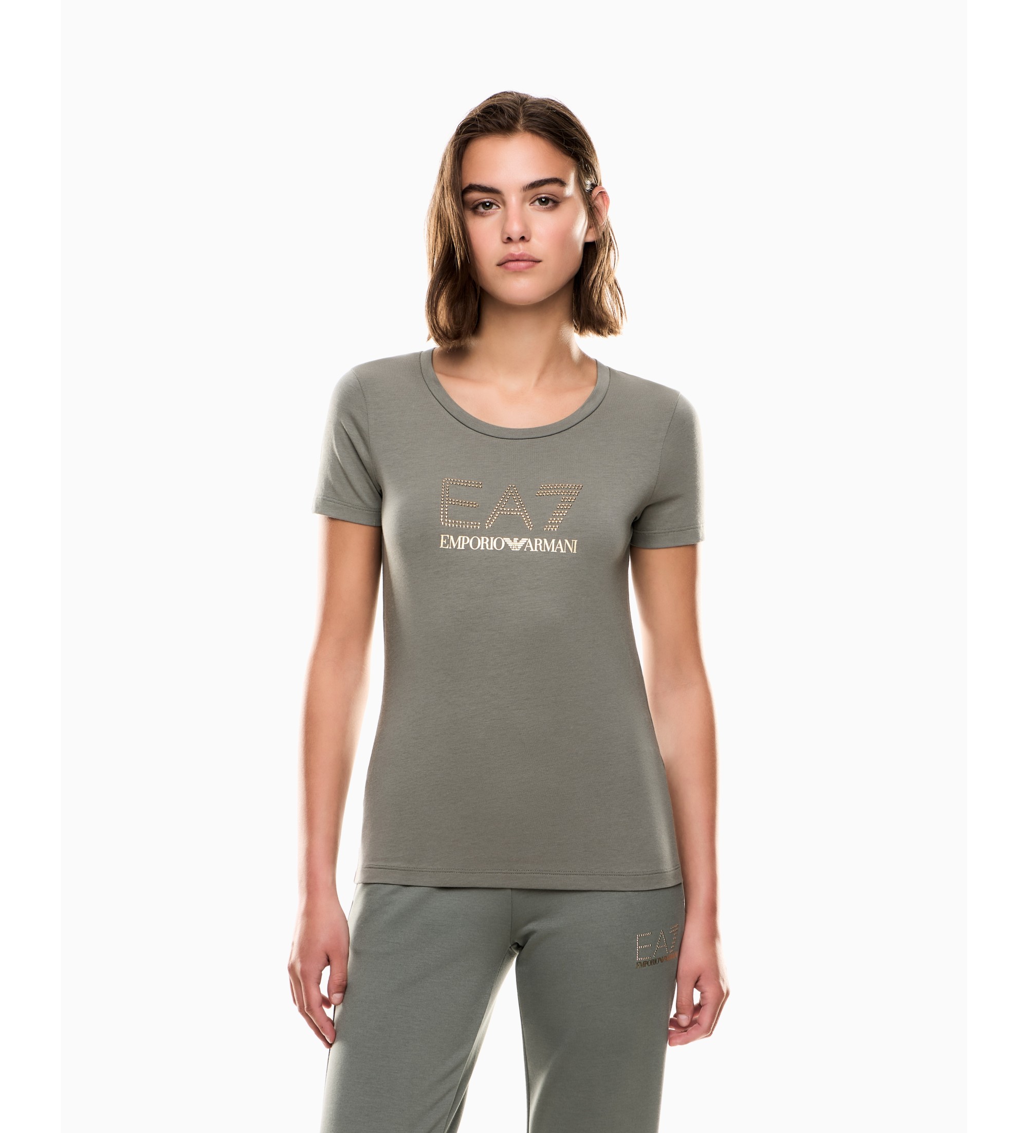 Uma T-shirt contemporânea com gola redonda numa mistura suave de algodão e tecido modal elástico. O corte regular é personalizado com um maxilogótipo contrastante com micro-costura dourada, que confere brilho à peça de vestuário e recorda outras criações da linha Evolution.