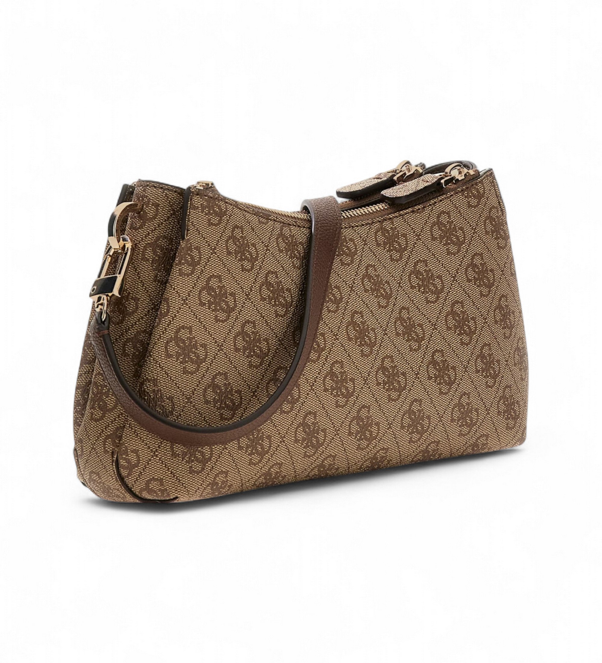 Mala de ombro Guess Mini Noelle em castanho, um design compacto e funcional com um acabamento elegante e moderno.