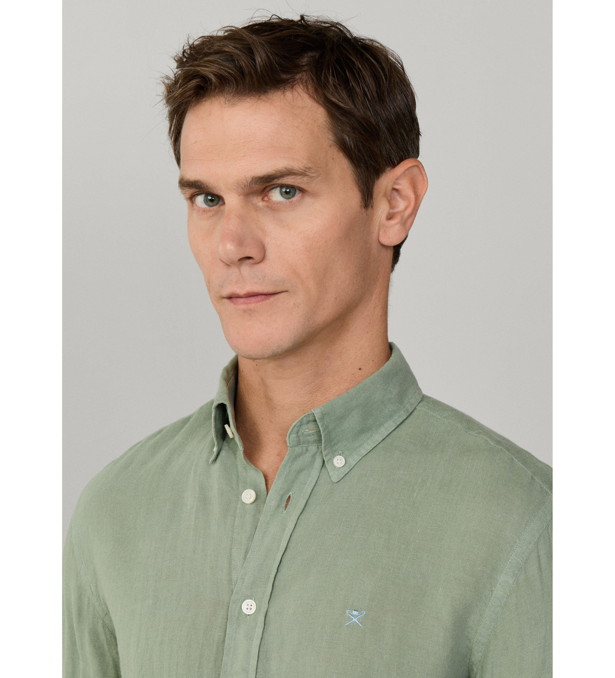 A camisa Hackett London, de corte à medida e sem botões, foi concebida para um estilo elegante mas descontraído. Confeccionada em 100% linho tingido à mão, oferece um acabamento fresco, leve e cheio de carácter. Apresenta um colarinho com botões Brompton com carcela aplicada e pormenores de assinatura da marca para elevar o design.