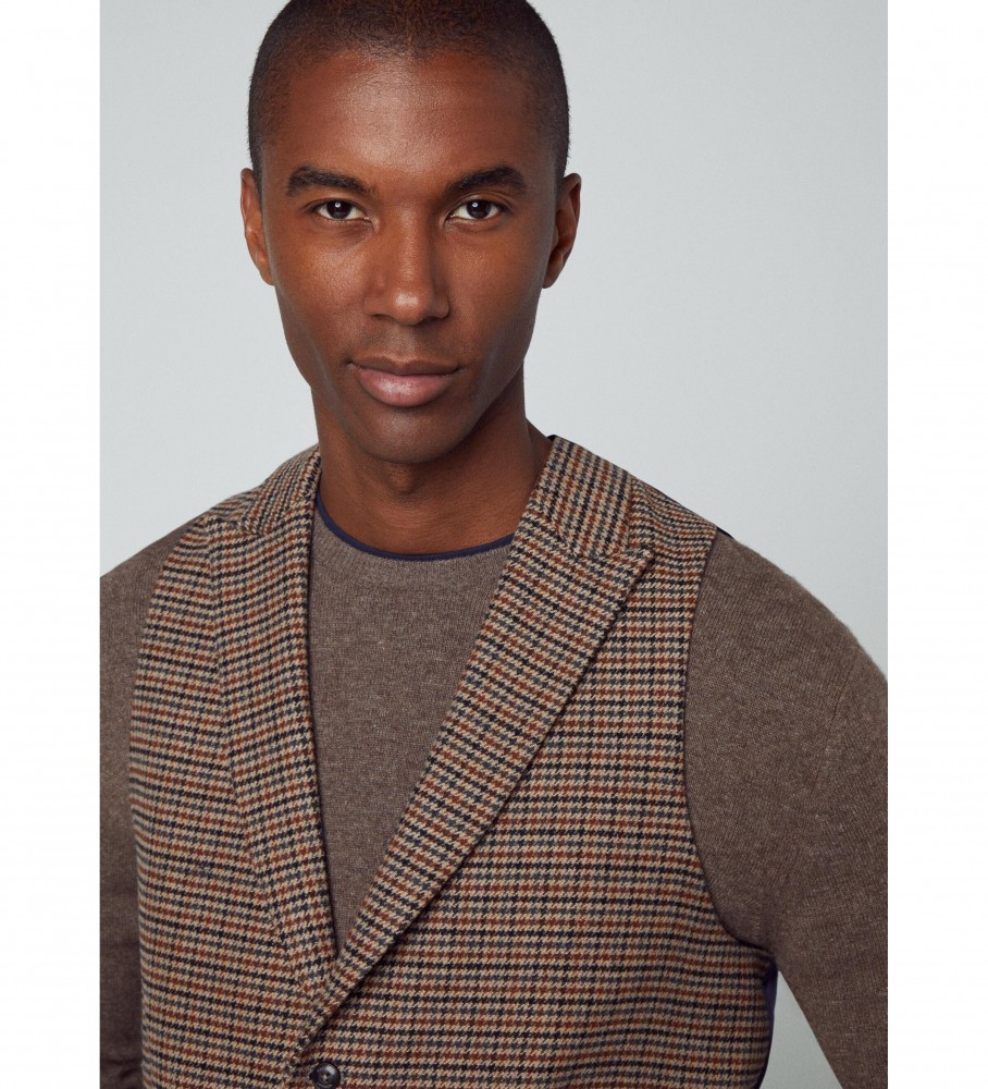 Colete clássico de lã em estilo houndstooth com lapela em bico e bolsos com pala, é apresentado em 3 peças ou pode ser usado separadamente.