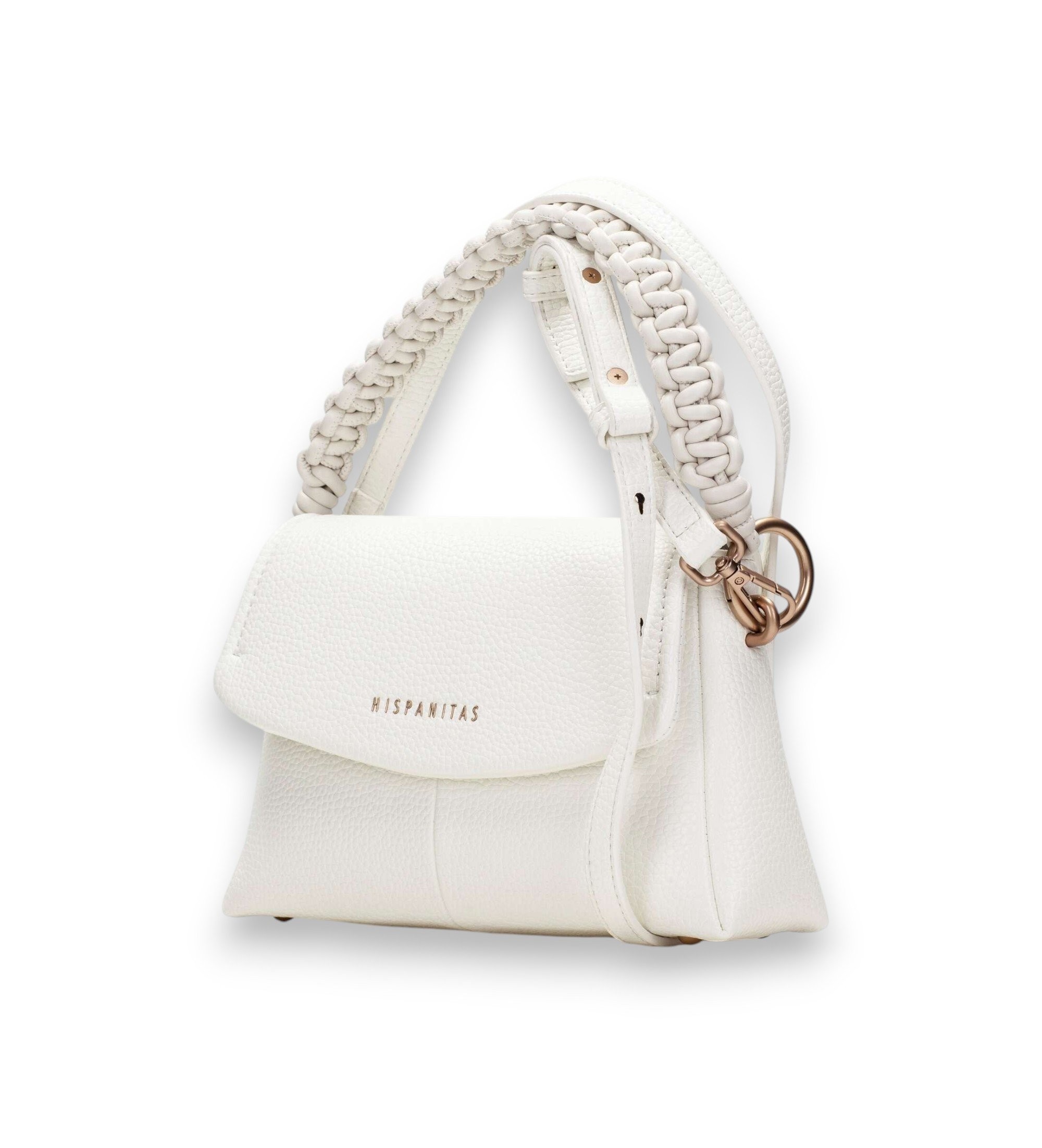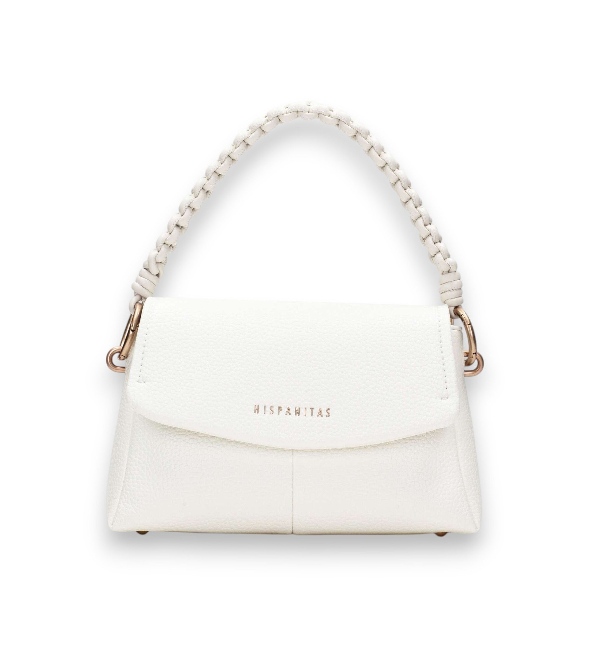 Uma pequena mala de ombro em PU com uma silhueta estruturada para elegância e versatilidade. A aba frontal com o logótipo da marca e a pega entrançada em macramé conferem um toque distinto e artesanal, ideal para completar os seus trajes com estilo.