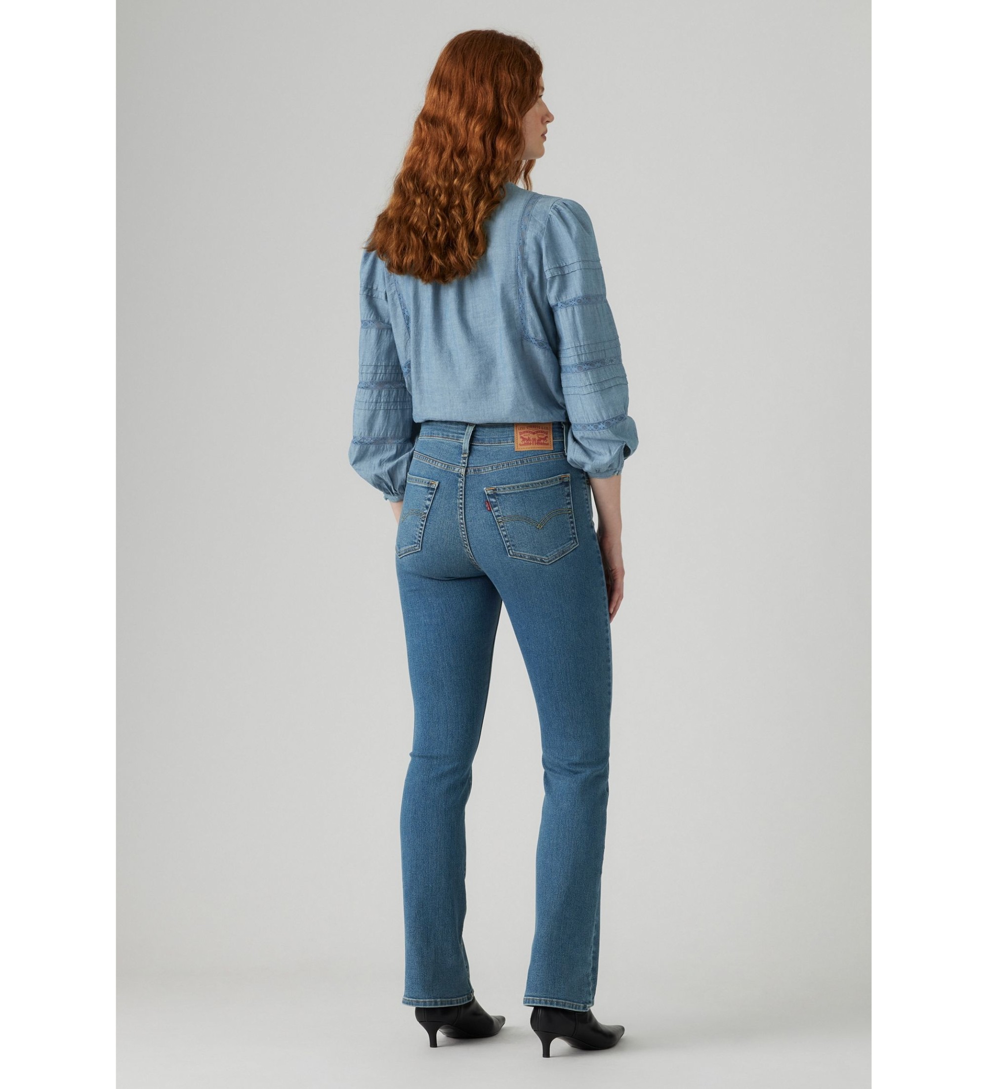 Calças de ganga de cintura alta com uma perna bootcut moderna, concebidas para uma silhueta lisonjeira e contemporânea.