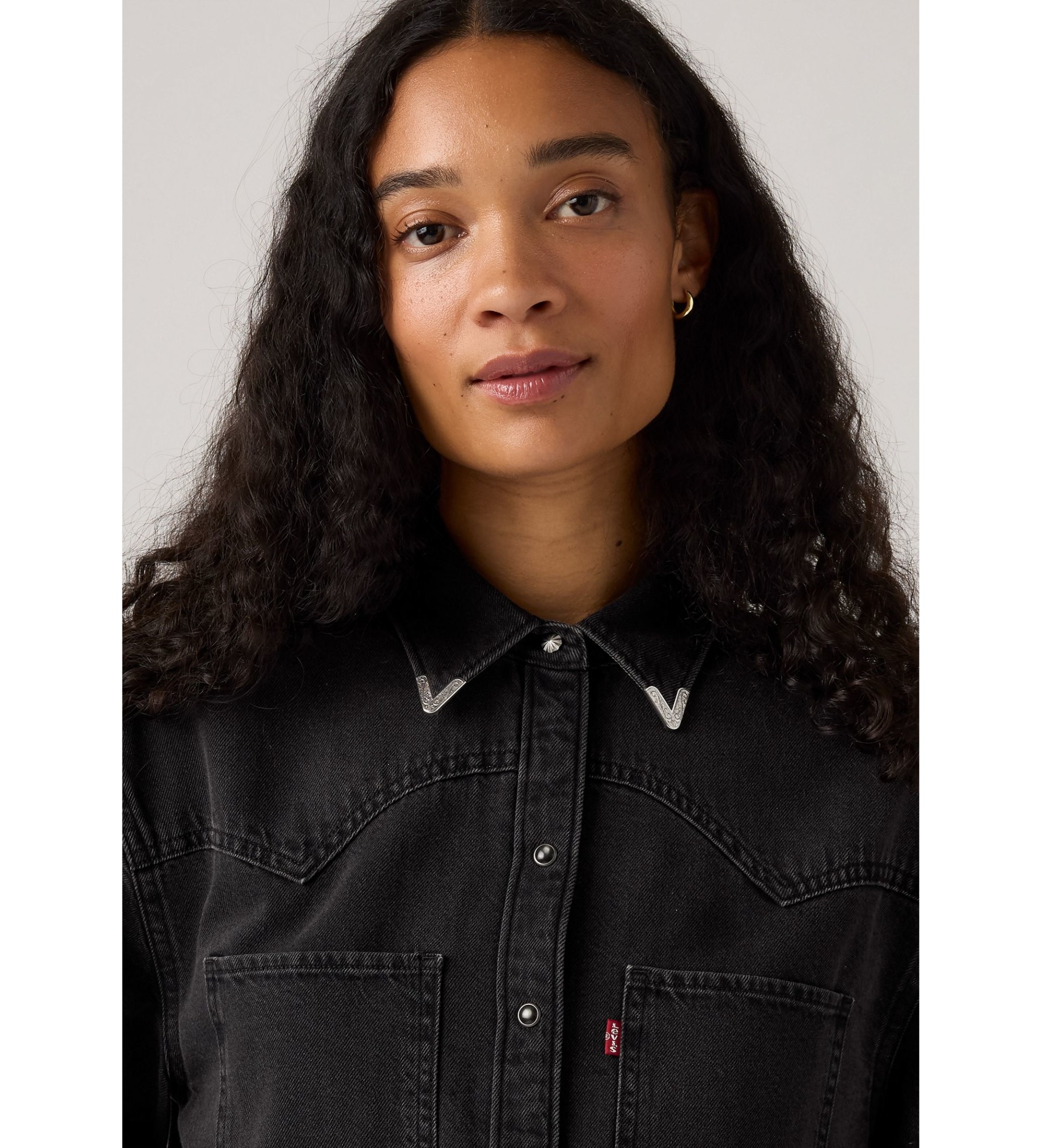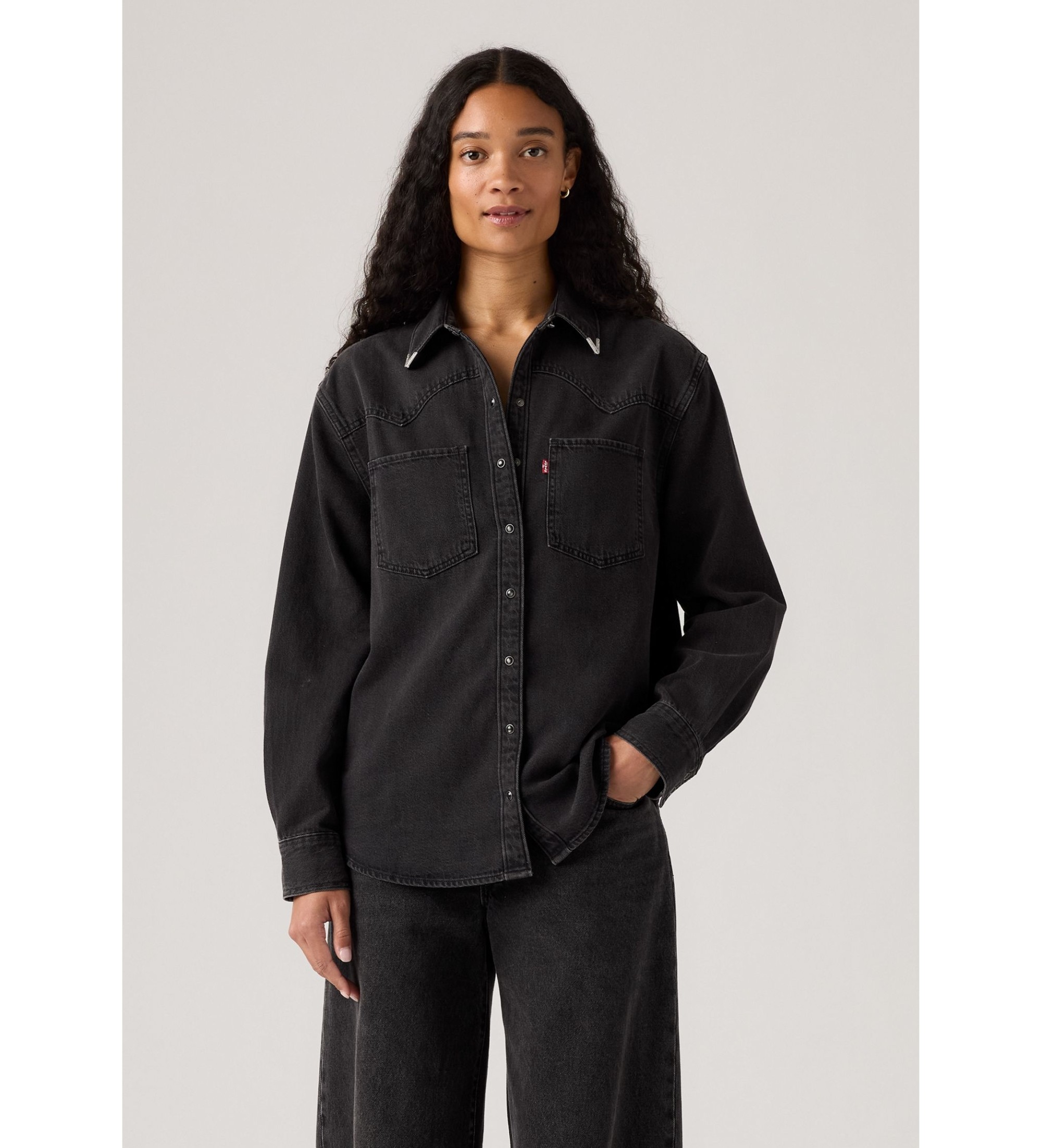 As botas de cowboy não estão incluídas. A nossa camisa ocidental Teodora é uma versão feminina de um ícone ocidental, com uma frente clássica de botões, dois bolsos de remendo, um corte justo e um design de encaixe inspirado na ganga.
