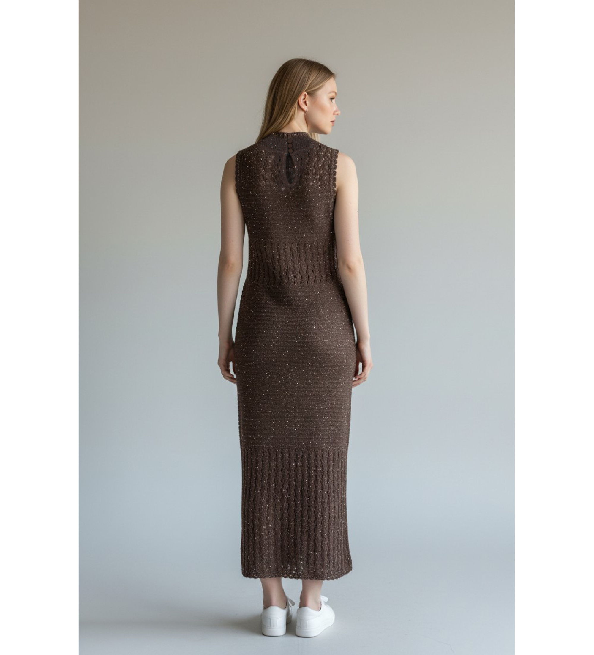 Uma peça sofisticada, cheia de carácter e sofisticada que combina o trabalho artesanal do tecido aberto com o brilho subtil das lantejoulas dispersas para um resultado elegante e festivo. Perfeito para ocasiões especiais que exigem um look comprido com personalidade e distinção.