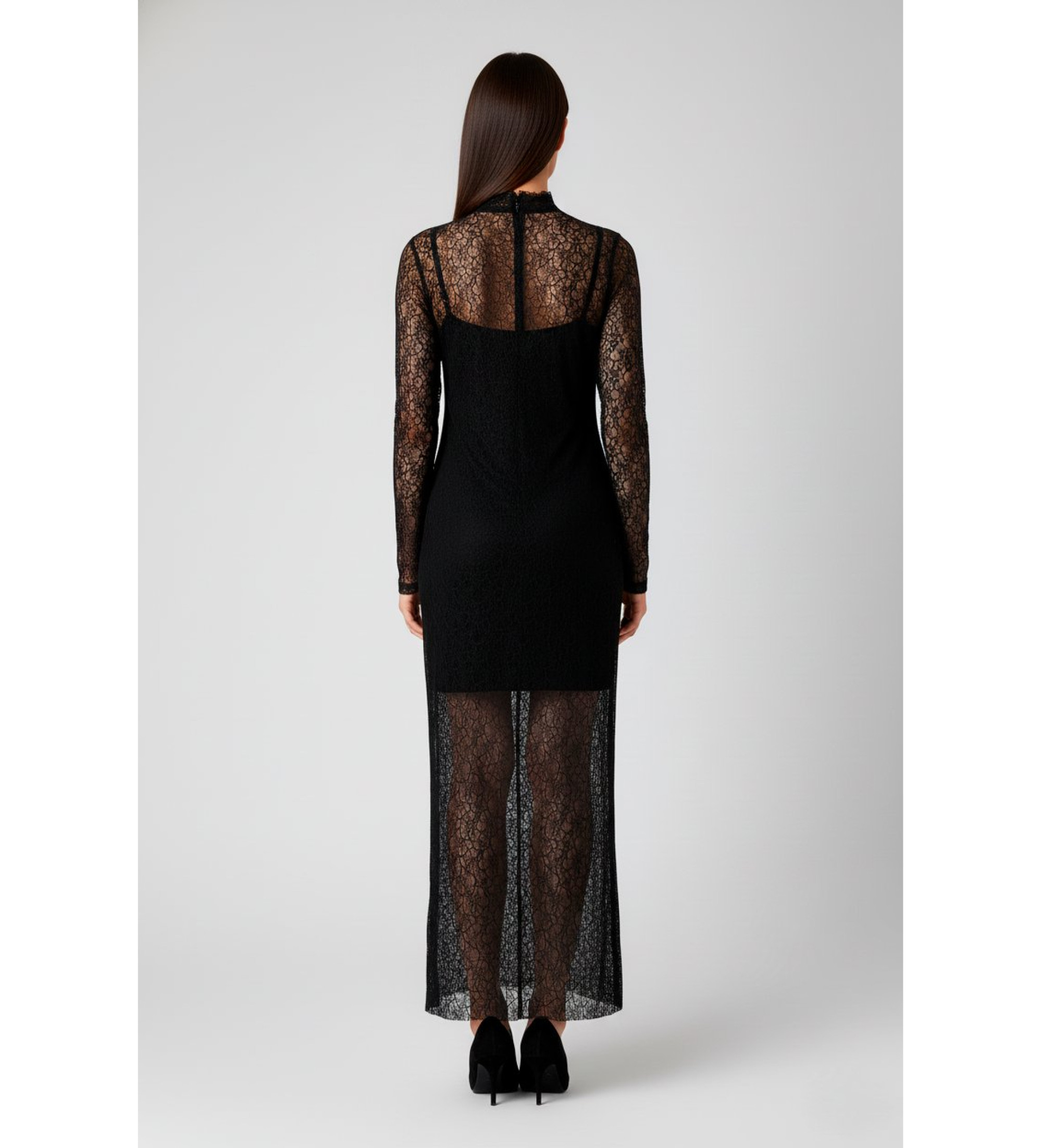 Vestido comprido em renda floral delicada, com um efeito semi-transparente que combina elegância e sensualidade. Inclui um forro slip a condizer, criando um contraste subtil com o tecido exterior. Apresenta mangas compridas, um decote redondo e um corte justo que emagrece a silhueta.