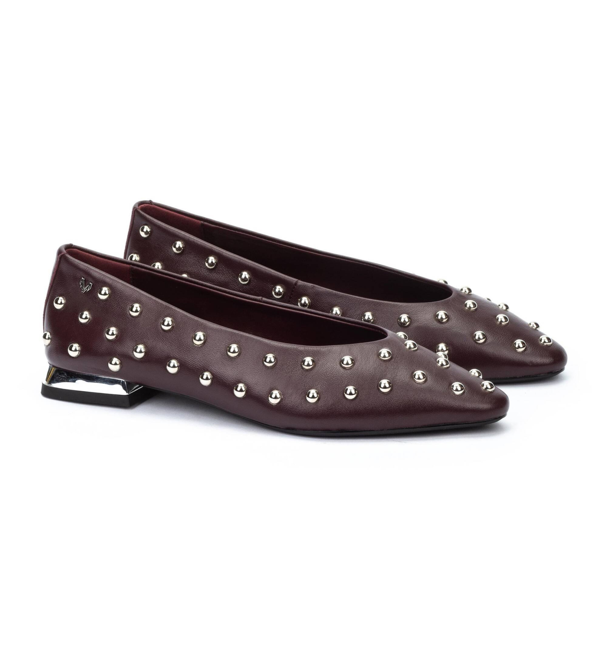 Bailarina Vescia. Bailarina em pele com tachas e salto metálico de 2,3 cm; biqueira amendoada. Aperte todos os dias com New Elegance, elegância e conforto actualizados.