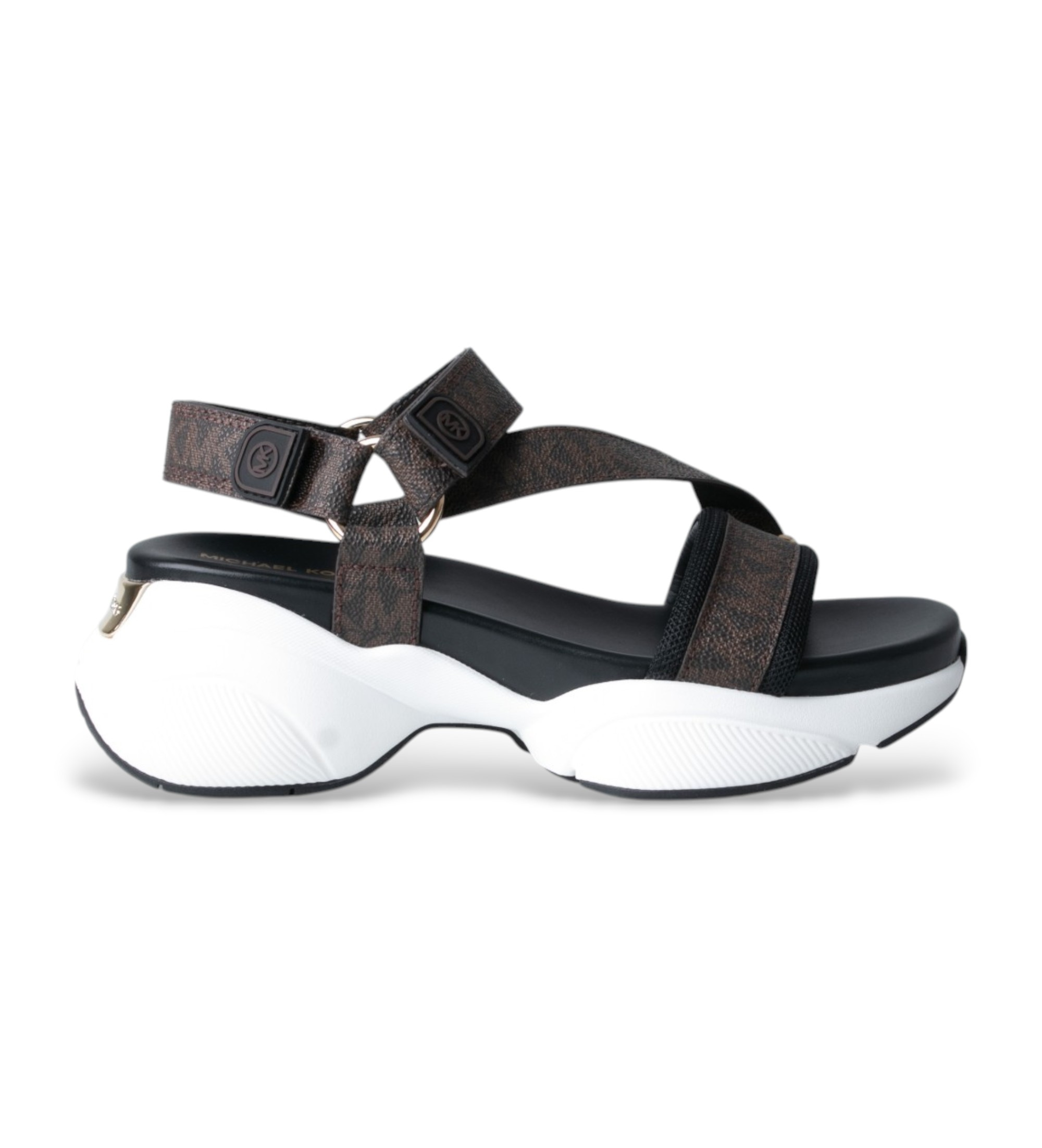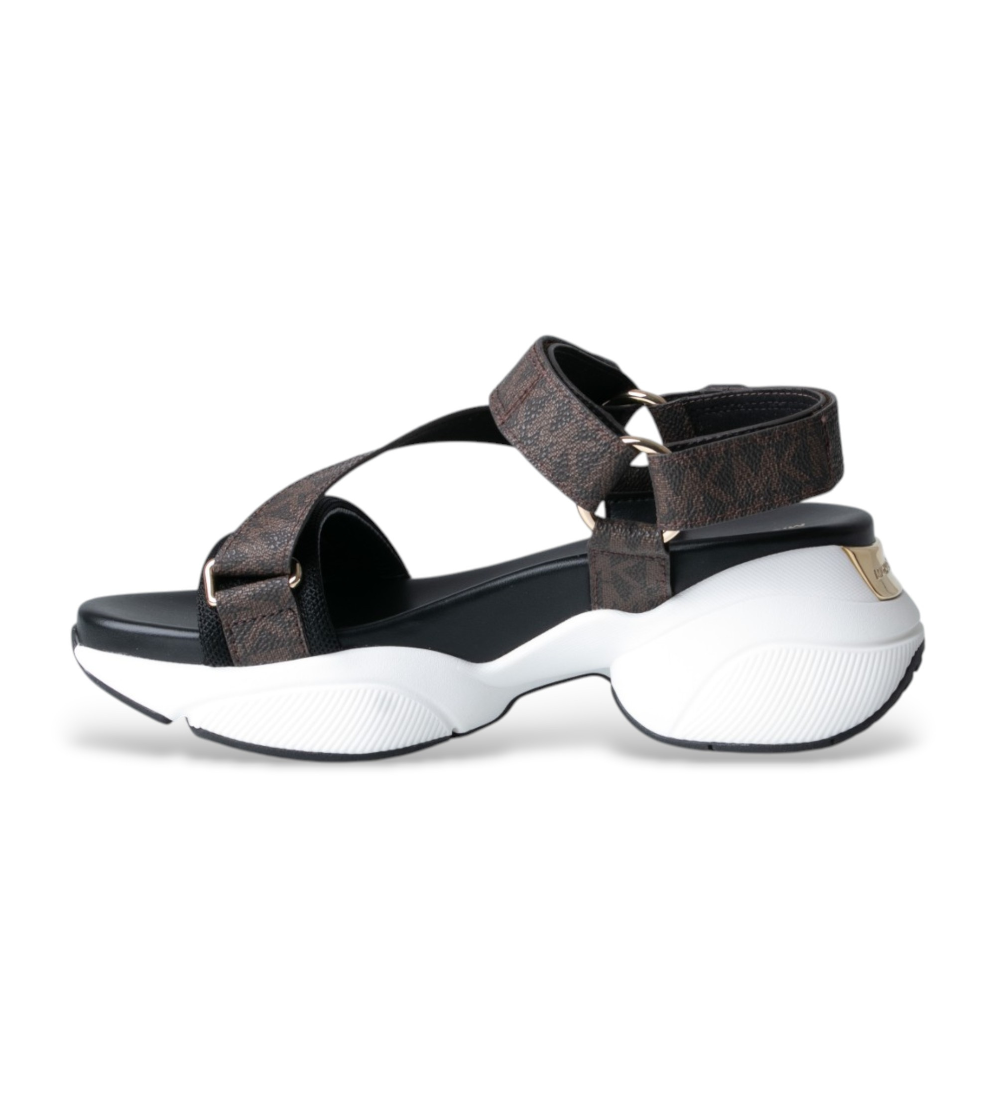 Uma sandália desportiva e chique com uma sola volumosa e uma plataforma volumosa que funde o conforto de um ténis com a leveza de uma sandália para um estilo sazonal com personalidade. As tiras cruzadas com o monograma de Michael Kors combinam-se com fechos de gancho e laço com logótipo em relevo e argolas douradas para criar um sapato com uma forte presença visual. A palmilha almofadada e a sola de borracha de dois tons garantem conforto durante todo o dia sem comprometer o estilo.