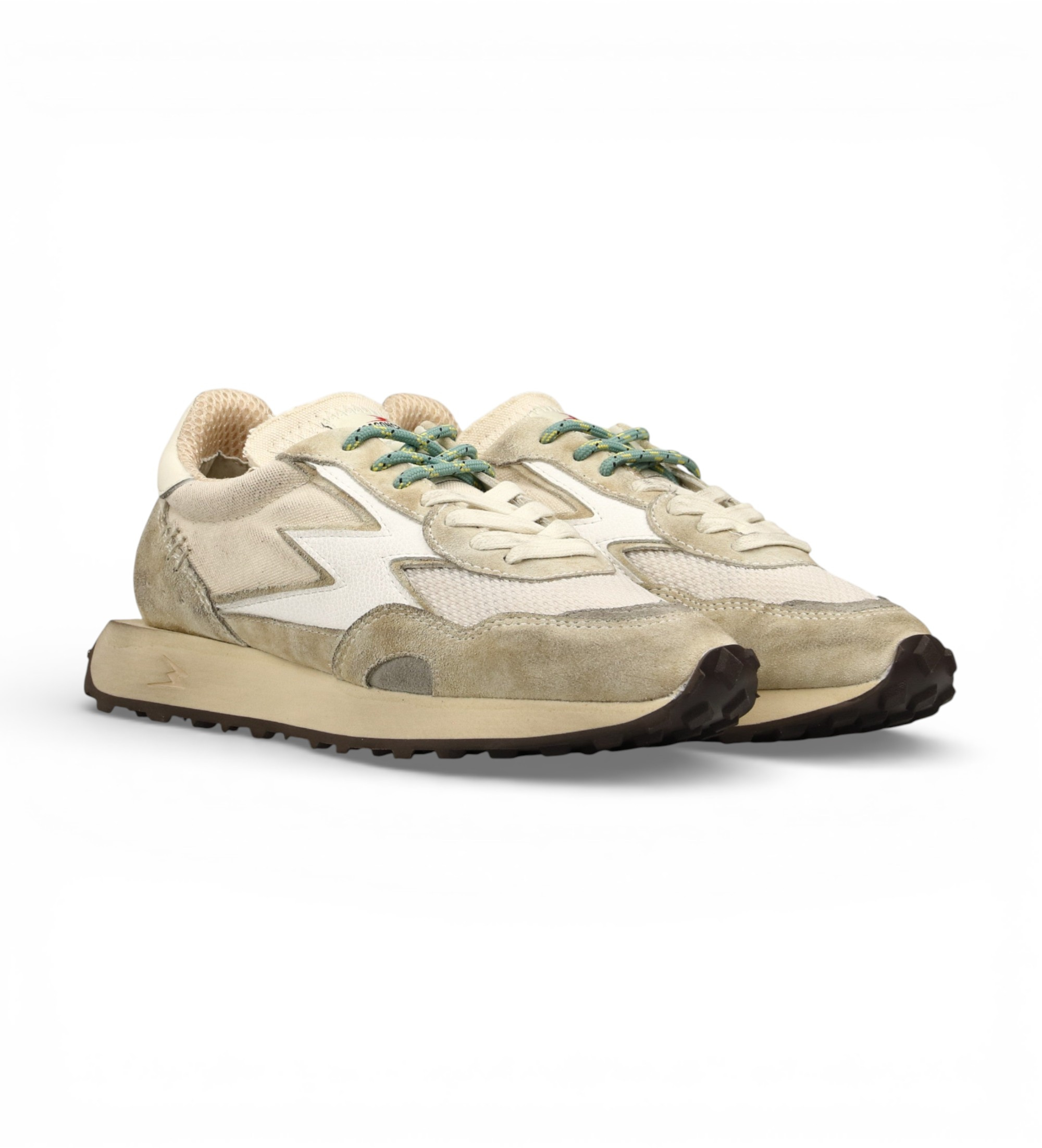 Ténis baixos unissexo concebidos em Itália em lona e camurça de areia lavada, com uma combinação de materiais naturais e detalhes artesanais que transmitem calma e sofisticação. Dois pares de atacadores e um pormenor de sola em dois tons conferem um carácter orgânico e exterior a um design limpo e intemporal.