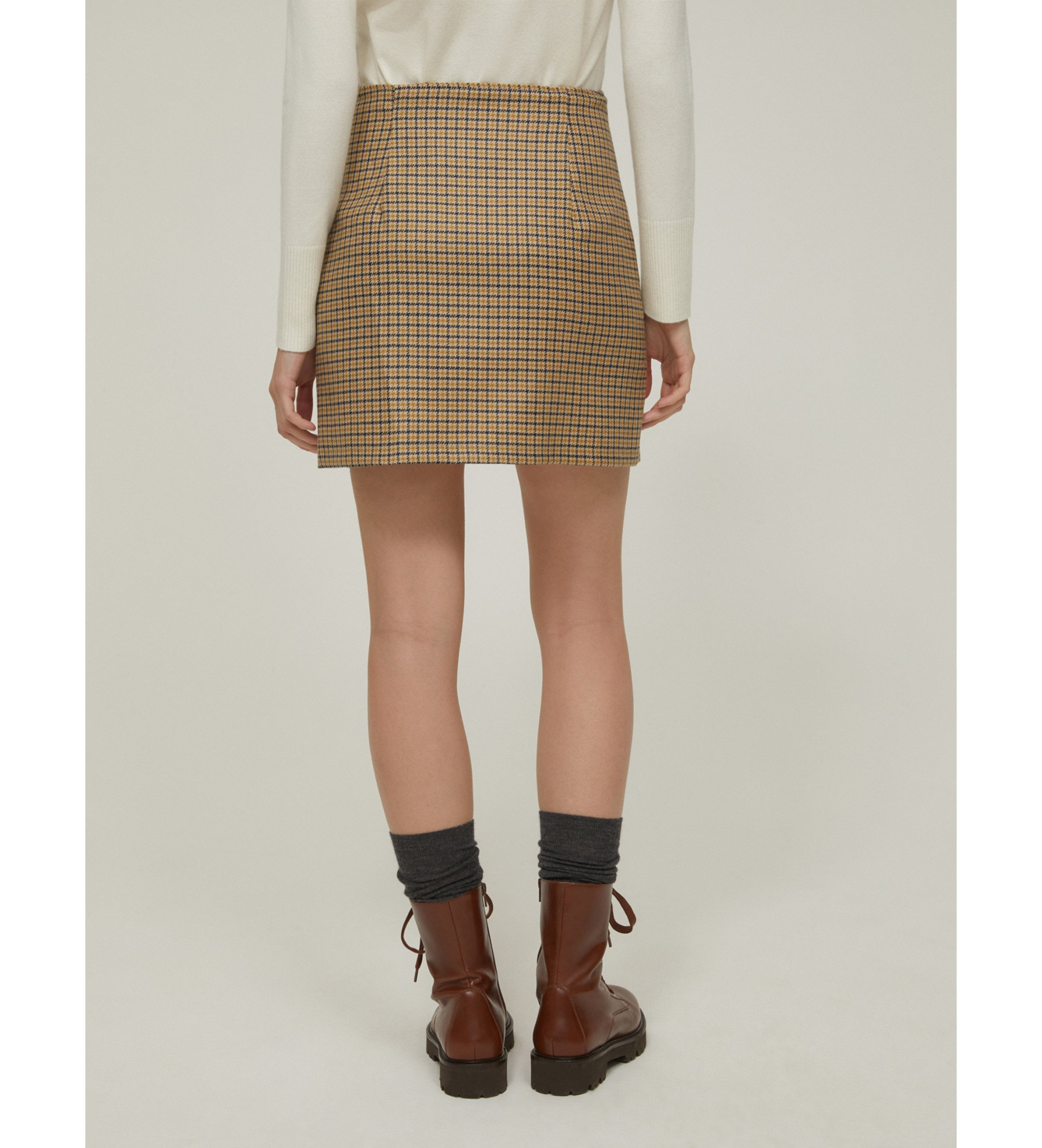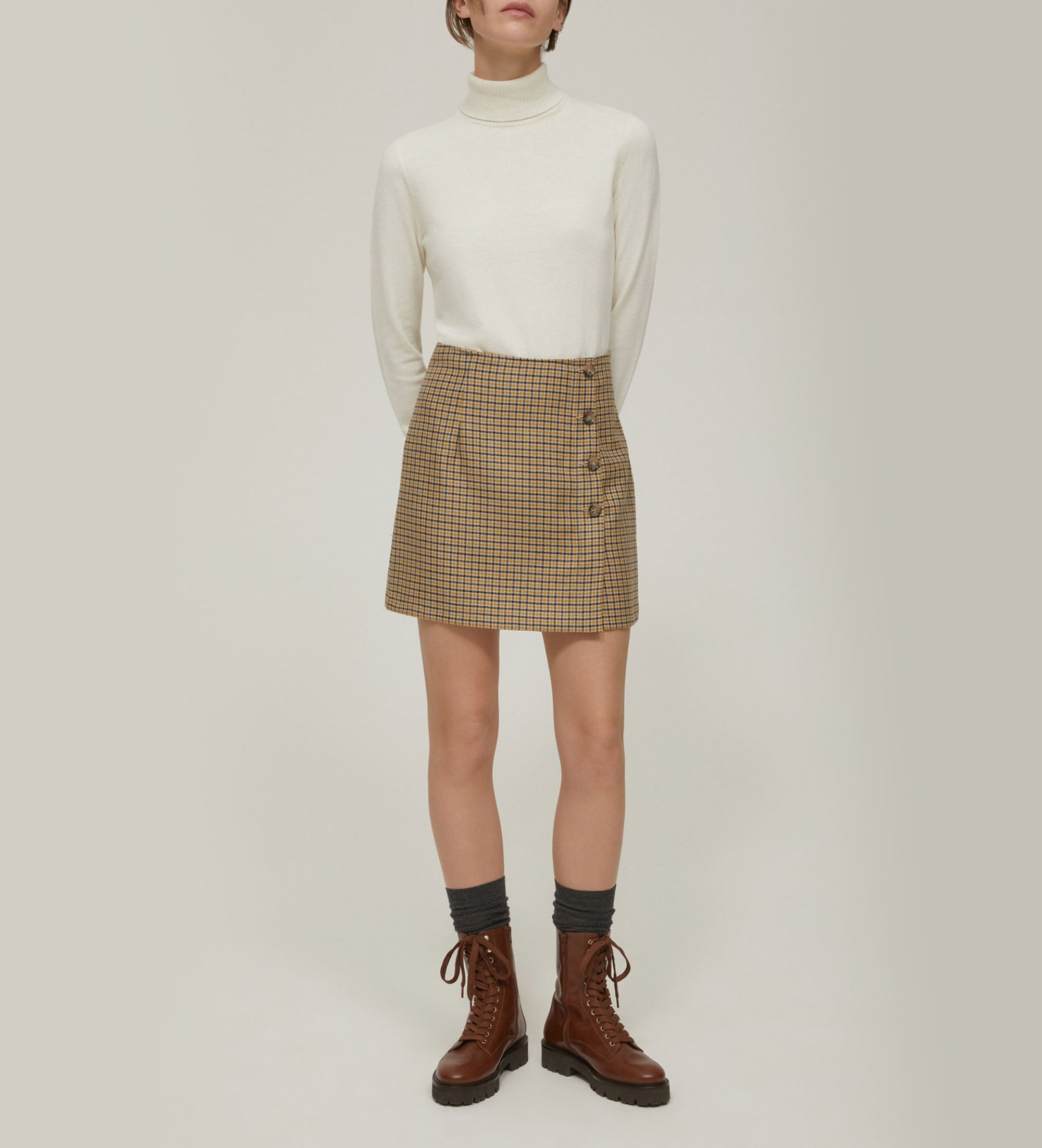 Uma minissaia em lã virgem com um design clássico inspirado no vestuário masculino, ideal para um look preppy chic com um toque britânico. Feita de lã tingida com fios, combina elegância e conforto, com um acabamento elegante e pormenores sofisticados.
