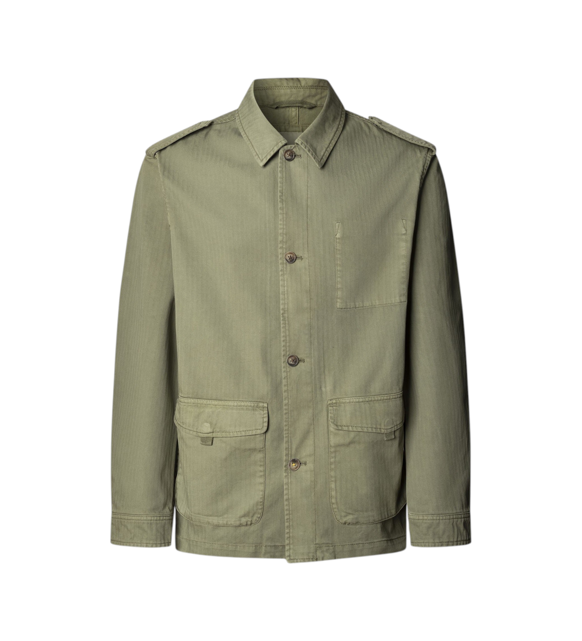 Casaco militar em algodão tingido com padrão de espinha de peixe. Bolsos largos com aba na bainha. Bolso interior no peito com costura visível no exterior. Ilhós nos ombros. Bolso interior com estampado.