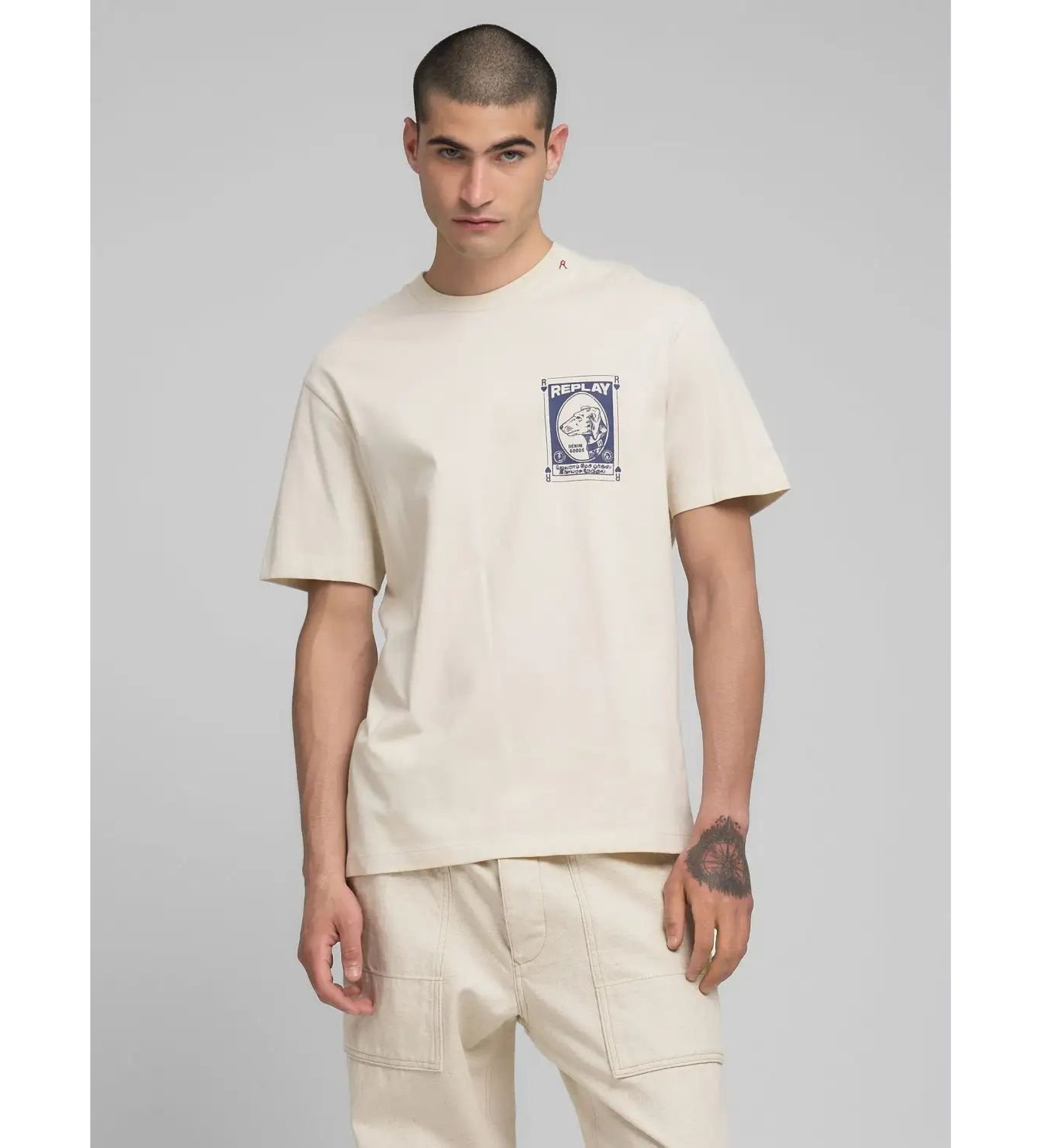 T-shirt de corte descontraído com gola redonda em jersey de algodão puro tingido em peça grossa, que garante suavidade e durabilidade. A T-shirt de manga curta para homem apresenta um estampado gráfico personalizado de inspiração vintage com um cão no peito, retrabalhado em formato maxi e com um efeito desbotado distinto nas costas. O modelo é rematado com o icónico bordado R na gola redonda.