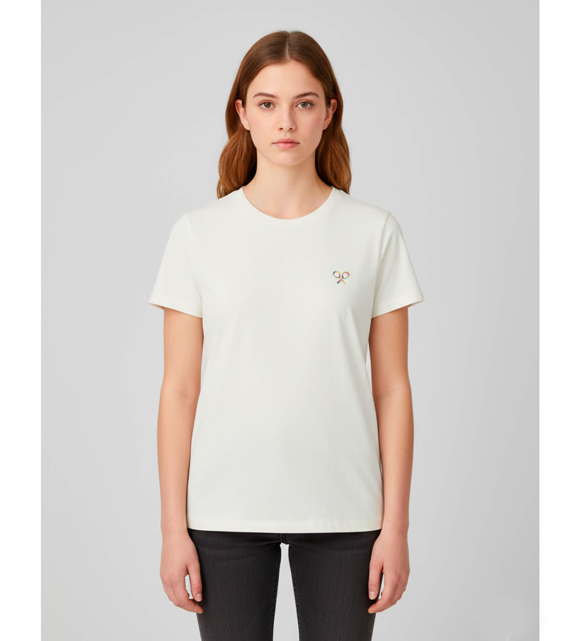 T-shirt branca de corte regular para mulher, 100% algodão. Apresenta um bordado multicolorido nas costas e um bordado de raquete no tronco. Tem um decote redondo e mangas curtas.