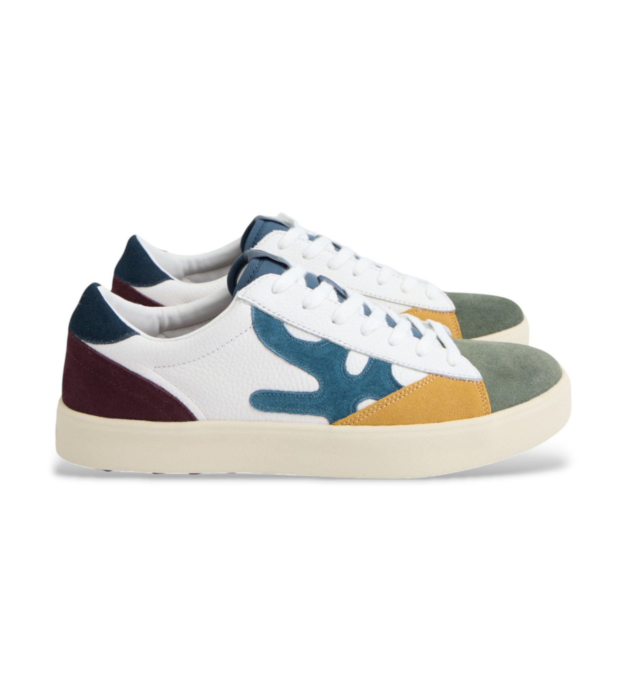 Sapatilha CLASSY09 multicolorida em couro. Com fecho de correr em pele crua e língua em pele azul com a inscrição "Silbon" gravada. Apresenta uma biqueira em pele verde e um calcanhar borgonha com pormenor azul no calcanhar e na raquete. Base em tecido branco e raquete lateral azul com pormenor amarelo. Sola de borracha confortável e forro em pele macia. Atacadores sobresselentes em azul.