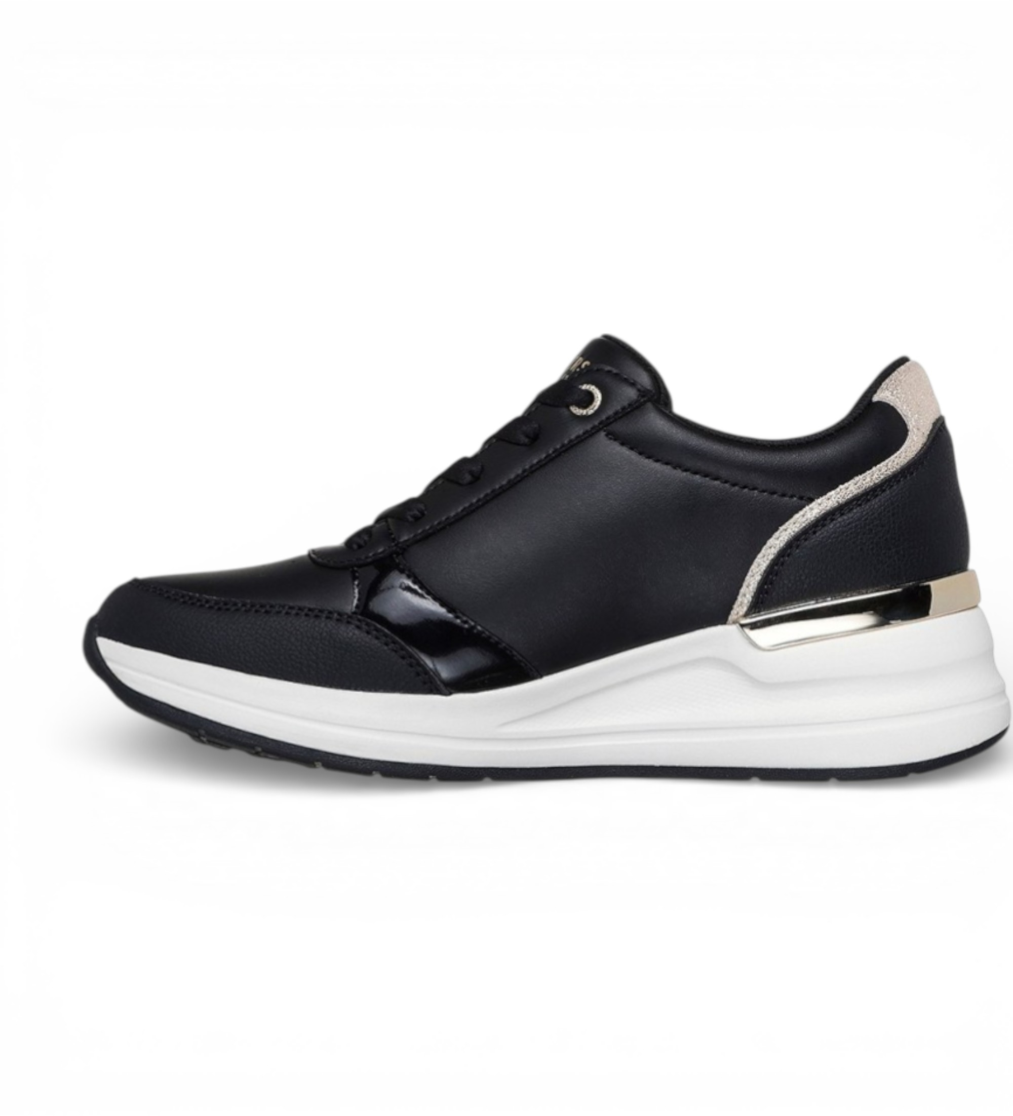 Sapatilhas Skechers em preto com detalhes dourados que combinam conforto e estilo urbano num design sofisticado. Um ténis de plataforma que eleva qualquer look casual sem sacrificar o conforto caraterístico da marca.