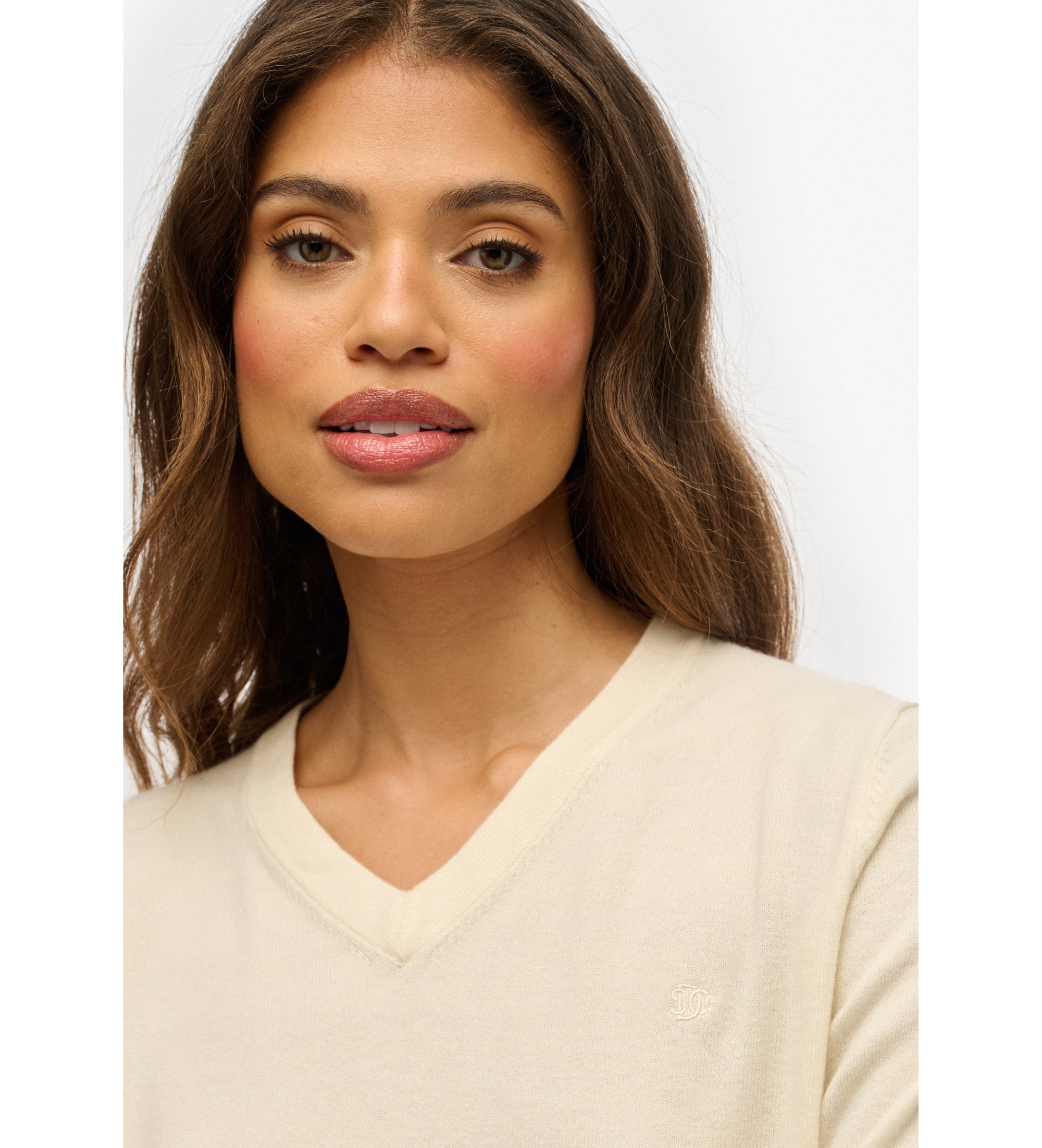 Camisola clássica com decote em V, elegante e minimalista, um básico versátil para o seu guarda-roupa nesta estação.