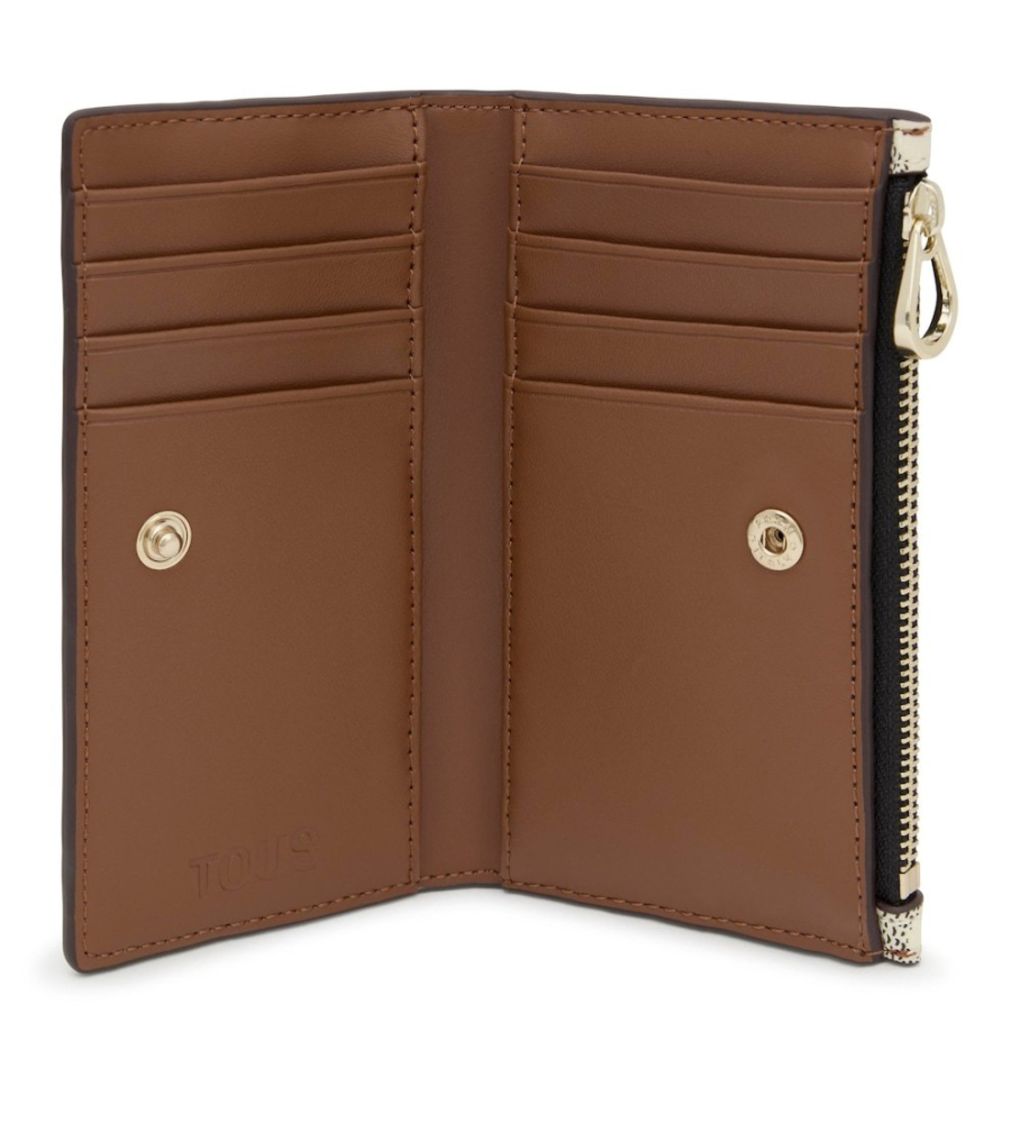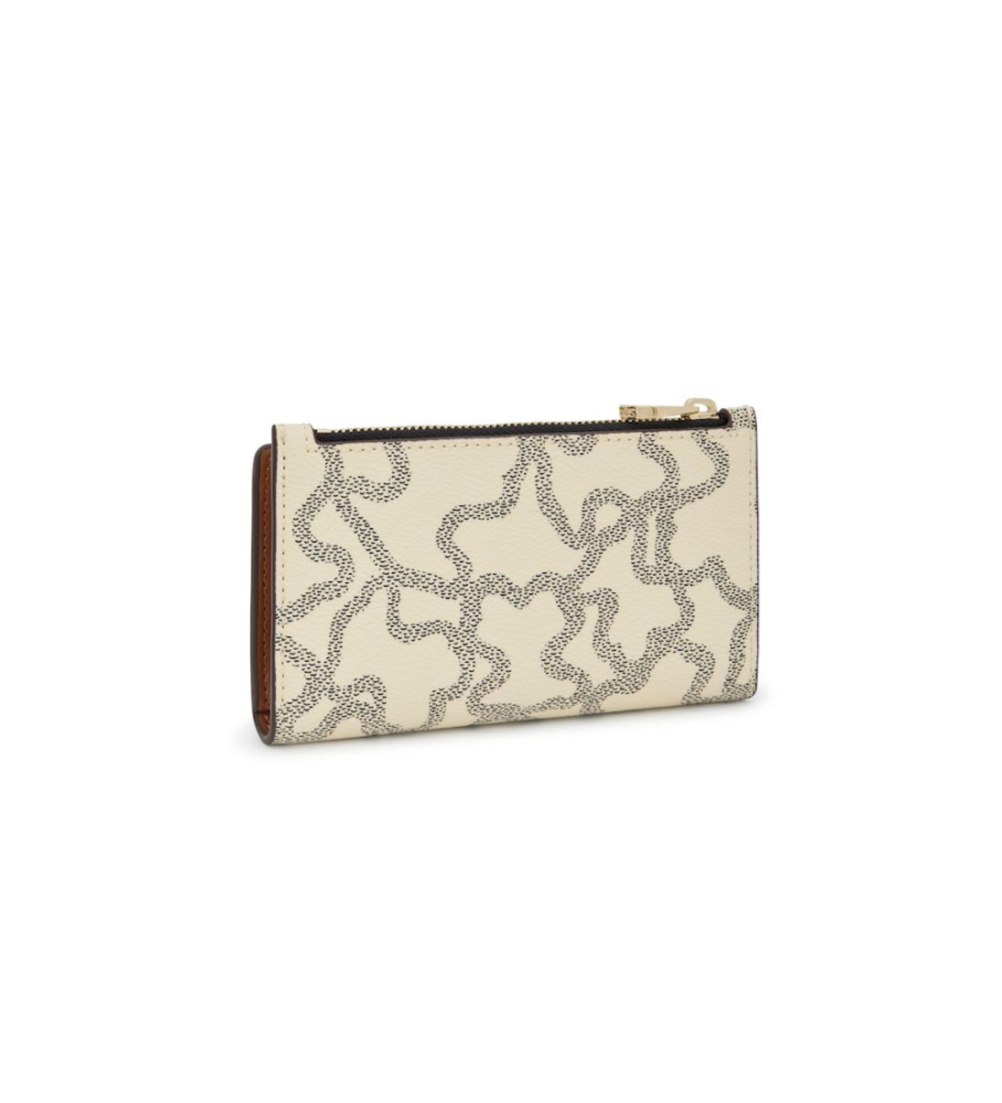 Carteira de lona bege com estampado Kaos Icon. Fecho de botão de pressão. Possui um compartimento para moedas com fecho de correr. O interior tem oito compartimentos para cartões e dois compartimentos para notas. Medidas (A x L x P): 8,5 x 14 x 2 cm.