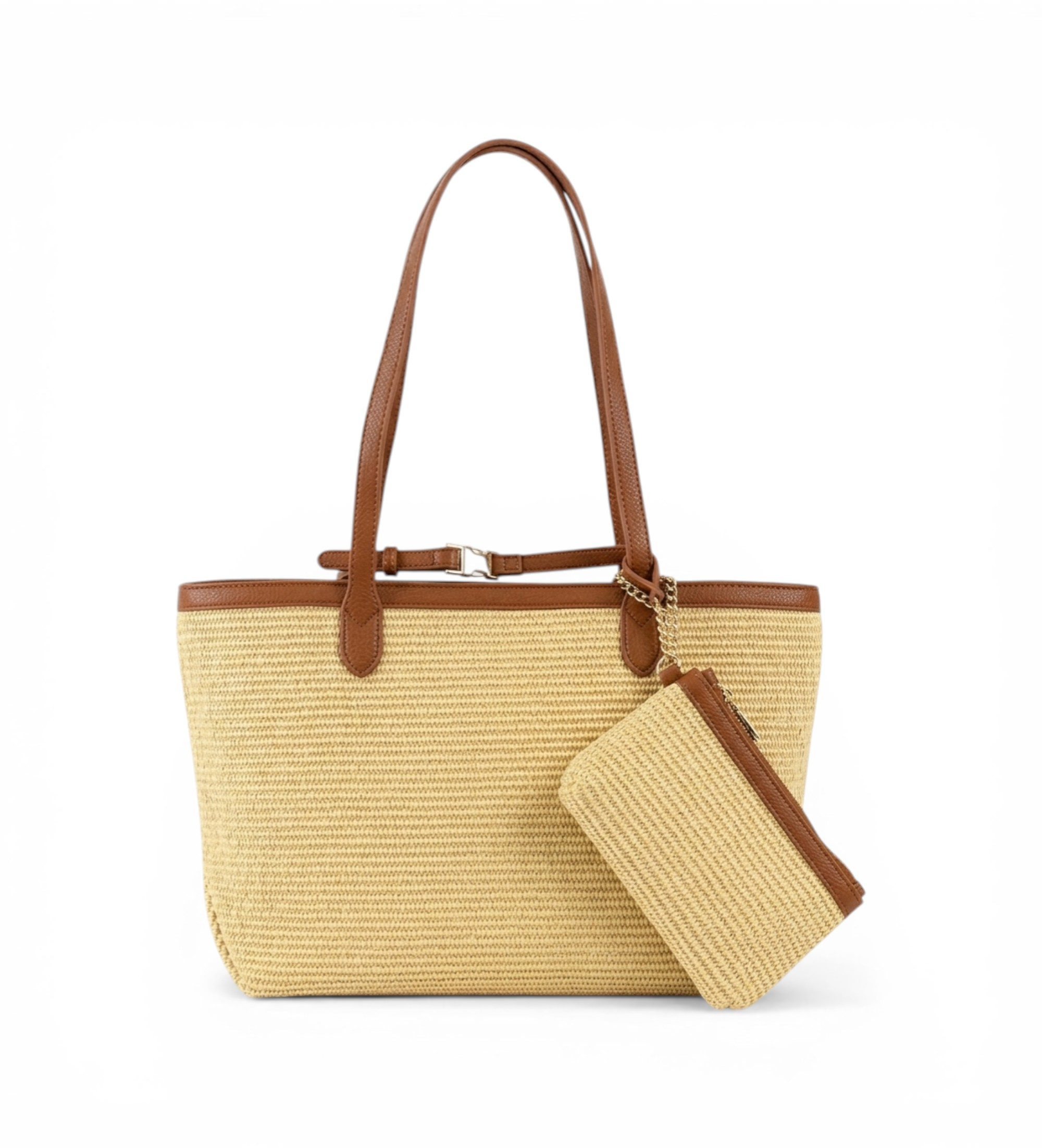 Saco de compras de grande capacidade em ráfia tecida natural, com acabamento em pele sintética preta e logótipo Valentino gravado em relevo, que confere carácter e personalidade. Inclui um mini-saco a condizer com alça de mão, perfeito para organizar os seus objectos essenciais. Um acessório que transita sem esforço da praia para o passeio, com a assinatura inconfundível da marca italiana.