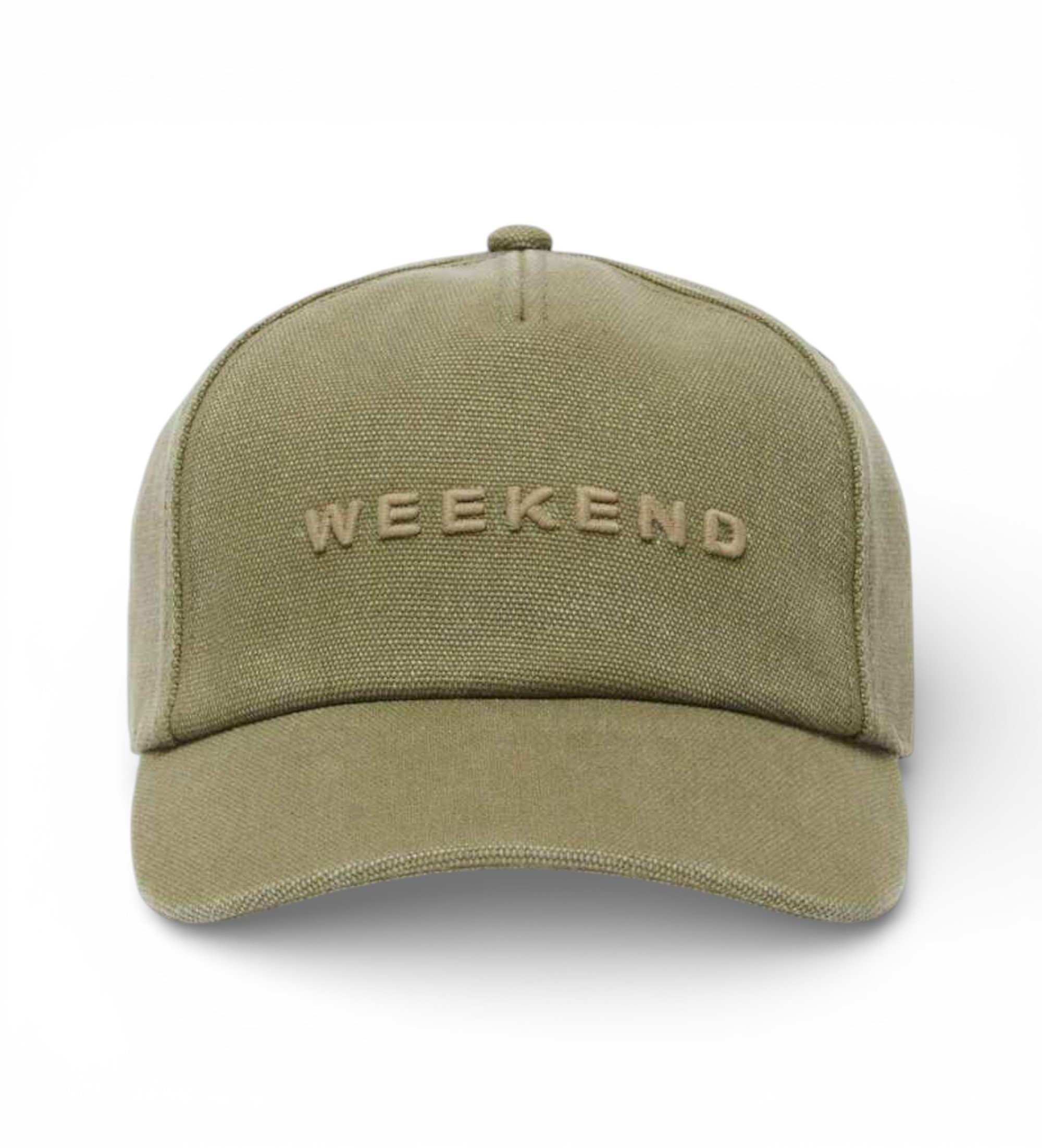 Boné de basebol com pala semi-rígida personalizado com as letras Weekend gravadas na frente.