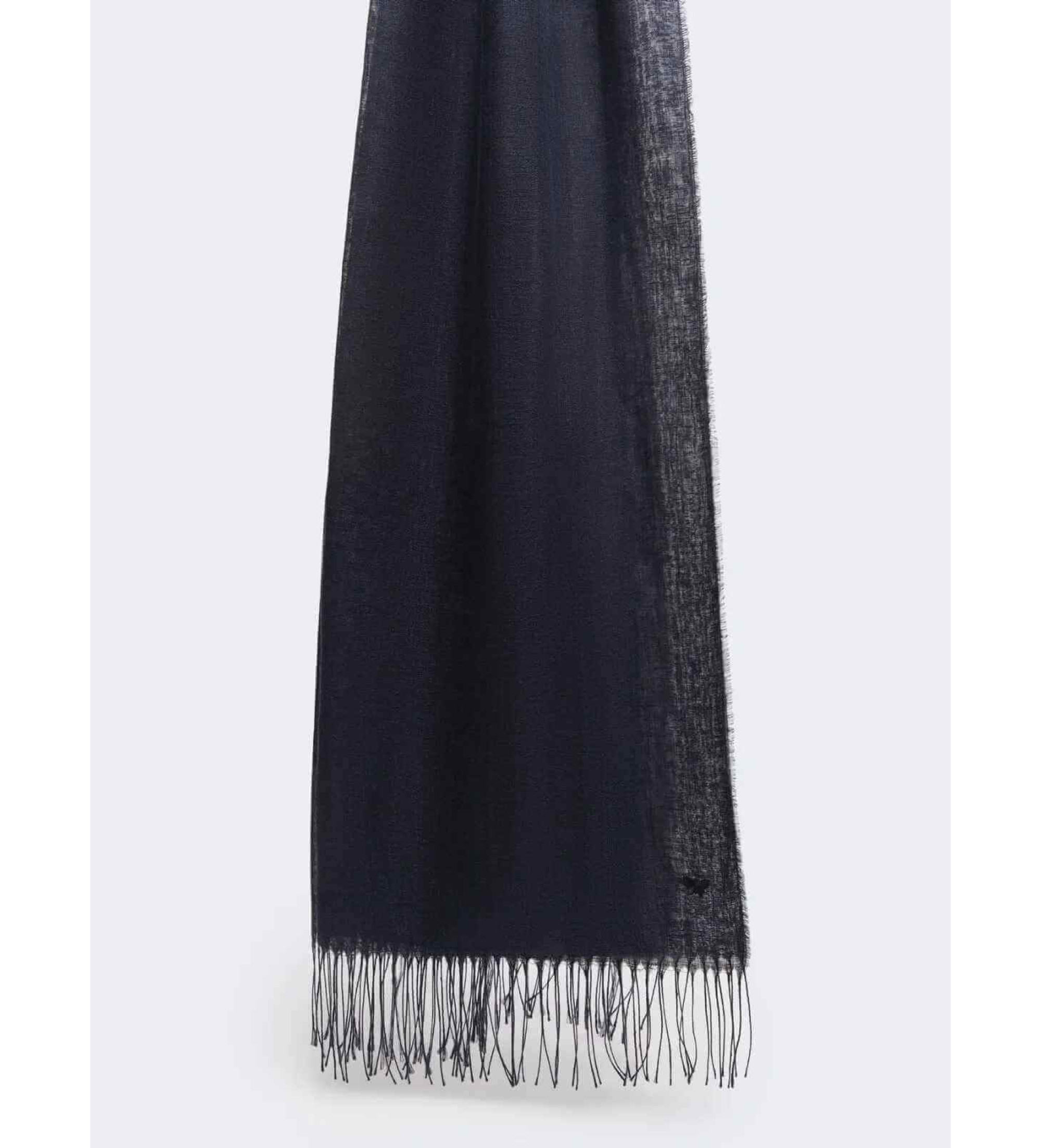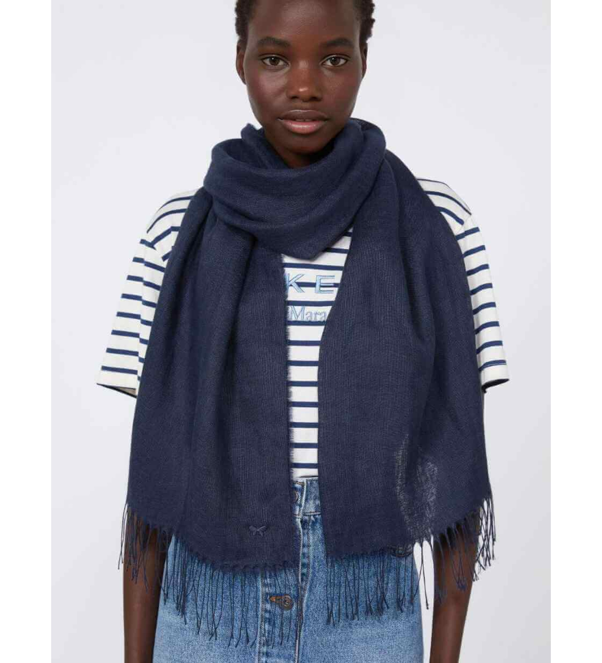 Estola de cor lisa com extremidades com franjas, adornada com um logótipo de borboleta a condizer bordado na bainha.