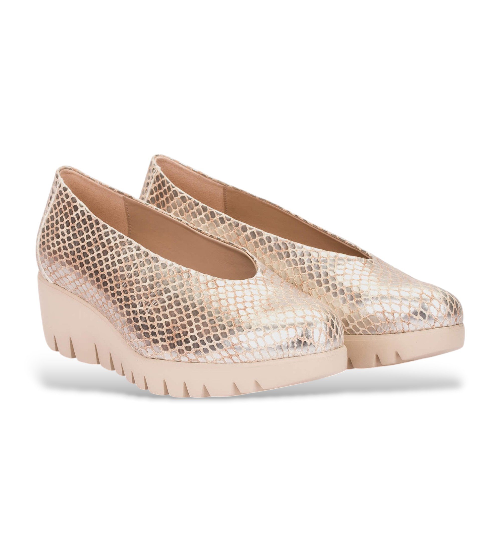 Sapatos de cunha FLY 00, feitos em pele com estampado de pele de cobra com um acabamento metálico. O design limpo e de corte baixo emagrece o peito do pé e facilita o calçar, tornando-o uma opção confortável e sofisticada para o uso diário. A sola, criada com a tecnologia WondersFly? by XL EXTRALIGHT®, garante uma leveza excecional e um conforto extraordinário. Além disso, a palmilha MemoryGel adapta-se perfeitamente ao pé, proporcionando conforto a cada passo. Prepare-se para sentir a sensação #YesWeFly. A Wonders está comprometida com a fabricação responsável, endossada pelo LEATHERWORKINGGROUP.