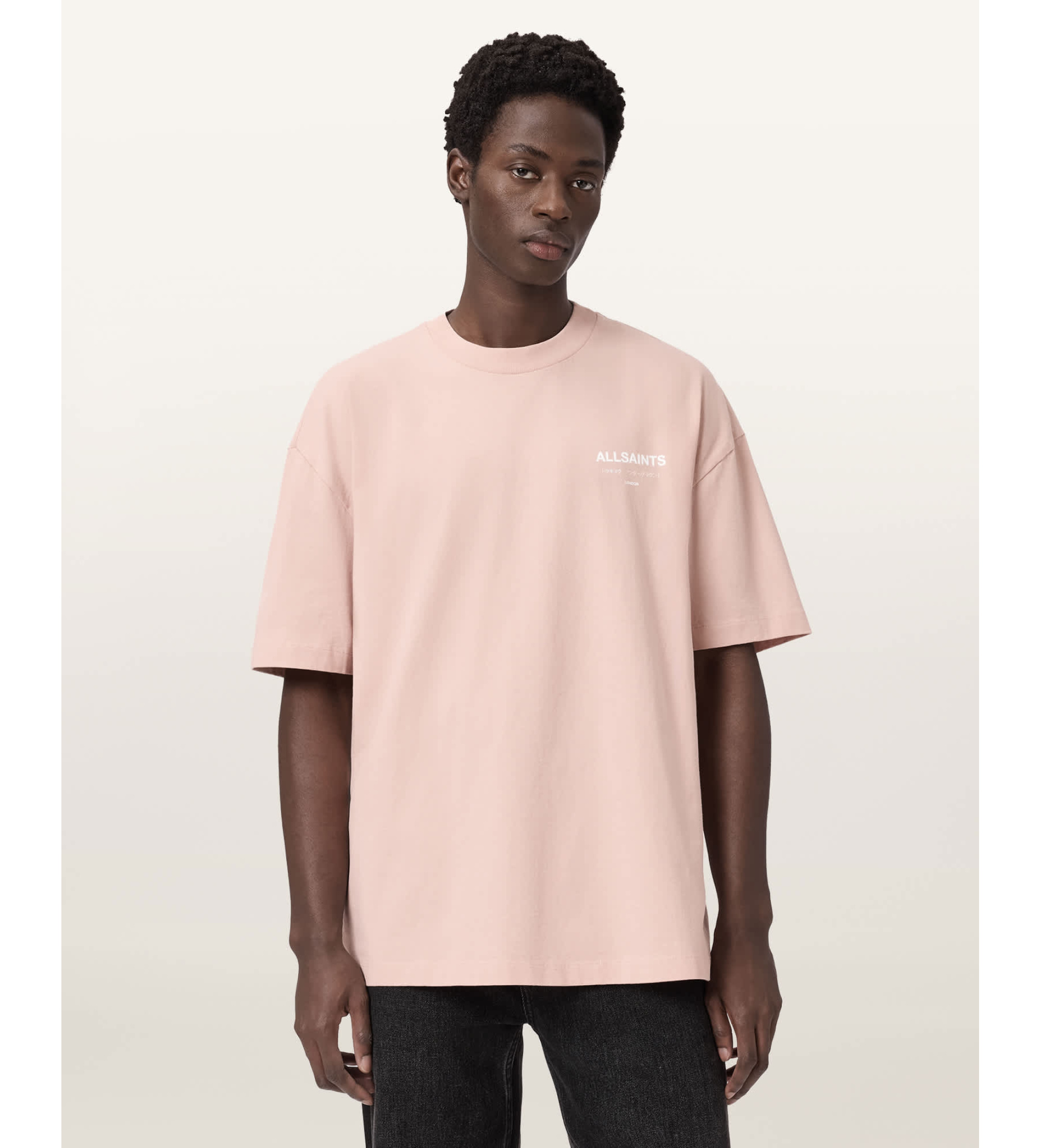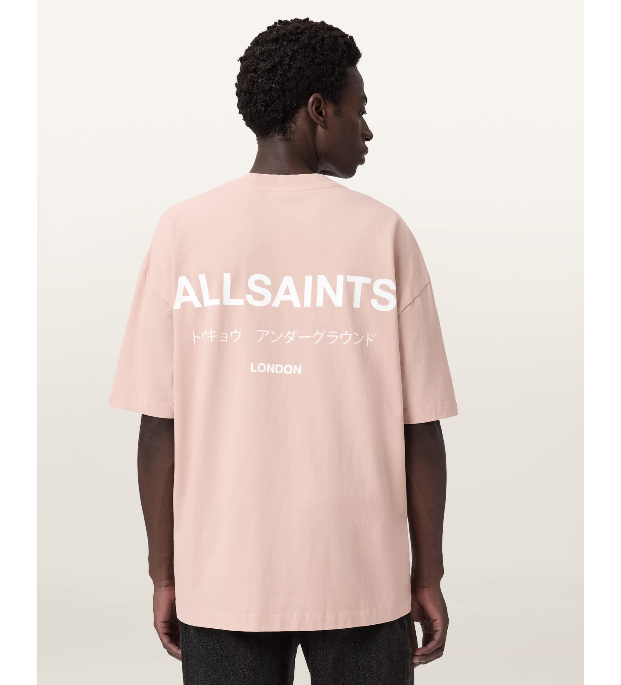 • Logotip AllSaints na prsih in sredini hrbta kot prepoznaven in značilen element blagovne znamke