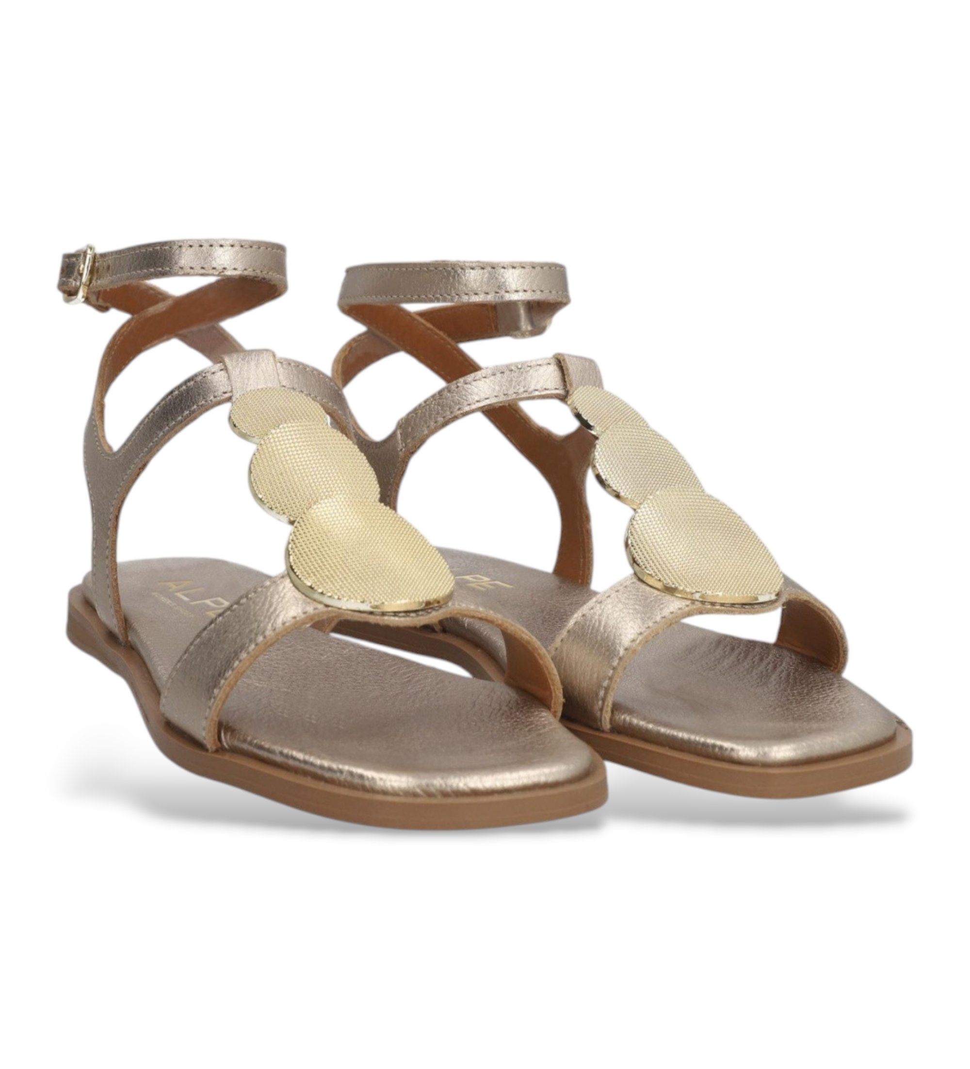 Zlata različica Alpejevega ravnega sandala z medaljoni, ki je svetleč, da bi dosegel največjo možno razsežnost. Zlato kovinsko usnje šampanjske barve - z značilno razpokano teksturo, ki zajame in pomnoži svetlobo - ustvarja podlago, v katero so teksturirani zlati medaljoni vključeni skoraj organsko, kot da bi bili del kovine same. Prekrižani trak za gleženj dodaja pridih grške prefinjenosti, ki dopolnjuje kos, namenjen sijaju.
