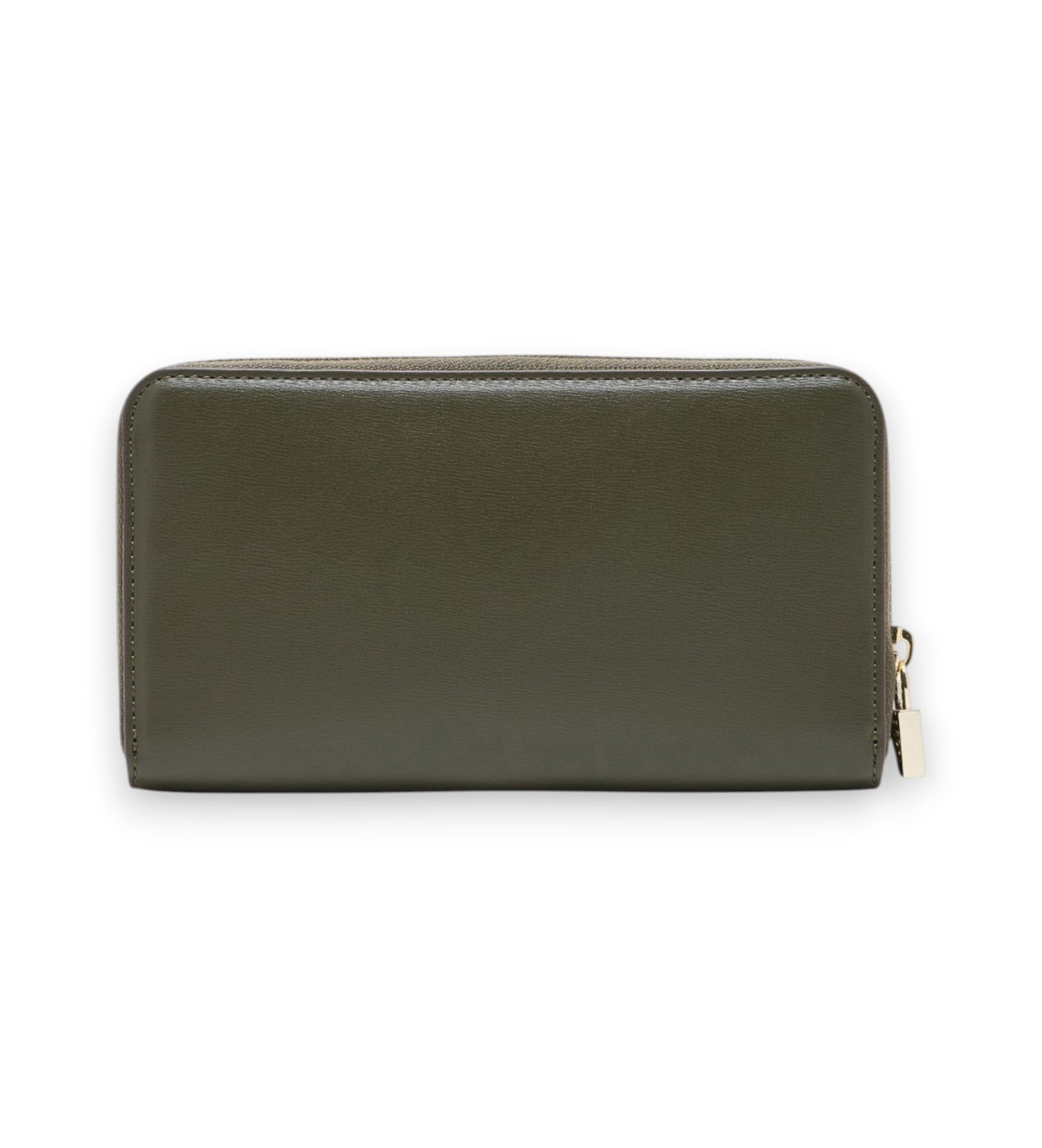 Ta velika denarnica z zadrgo je zasnovana za ženske in je praktičen vsakodnevni spremljevalec. Njeno zunanjost odlikujejo značilni šivi in premaz s kladivastim učinkom za subtilno teksturo, notranjost pa ponuja več vsestranskih predalčkov. Logotip na sprednji strani dodaja prefinjeno identiteto. Prevladujoča barva: zelena. Glavni material: 100 % poliester.