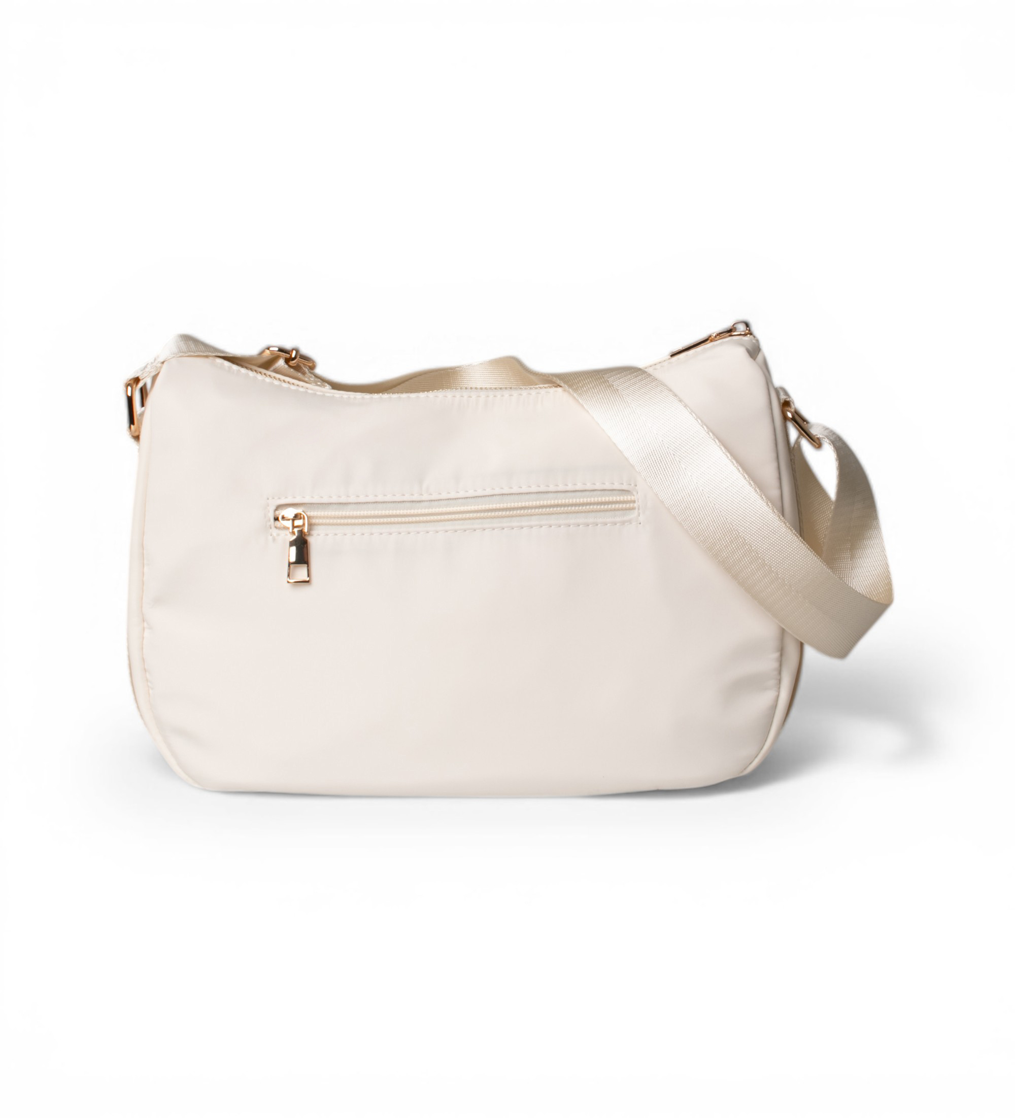 • Nastavljiv naramni pas s pozlačenimi kovinskimi zaponkami za eleganten zaključek