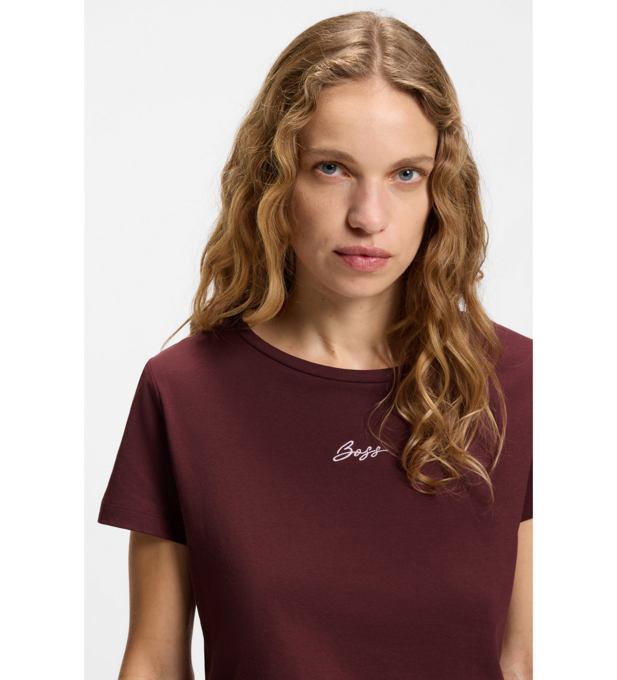 Ta kos BOSS Womenswear na novo ustvarja osnovno majico z logotipom z značilnim kaligrafskim logotipom, ki je izvezen na prsih. Ozko krojena majica. Izdelana iz mehkega bombažnega džersija.