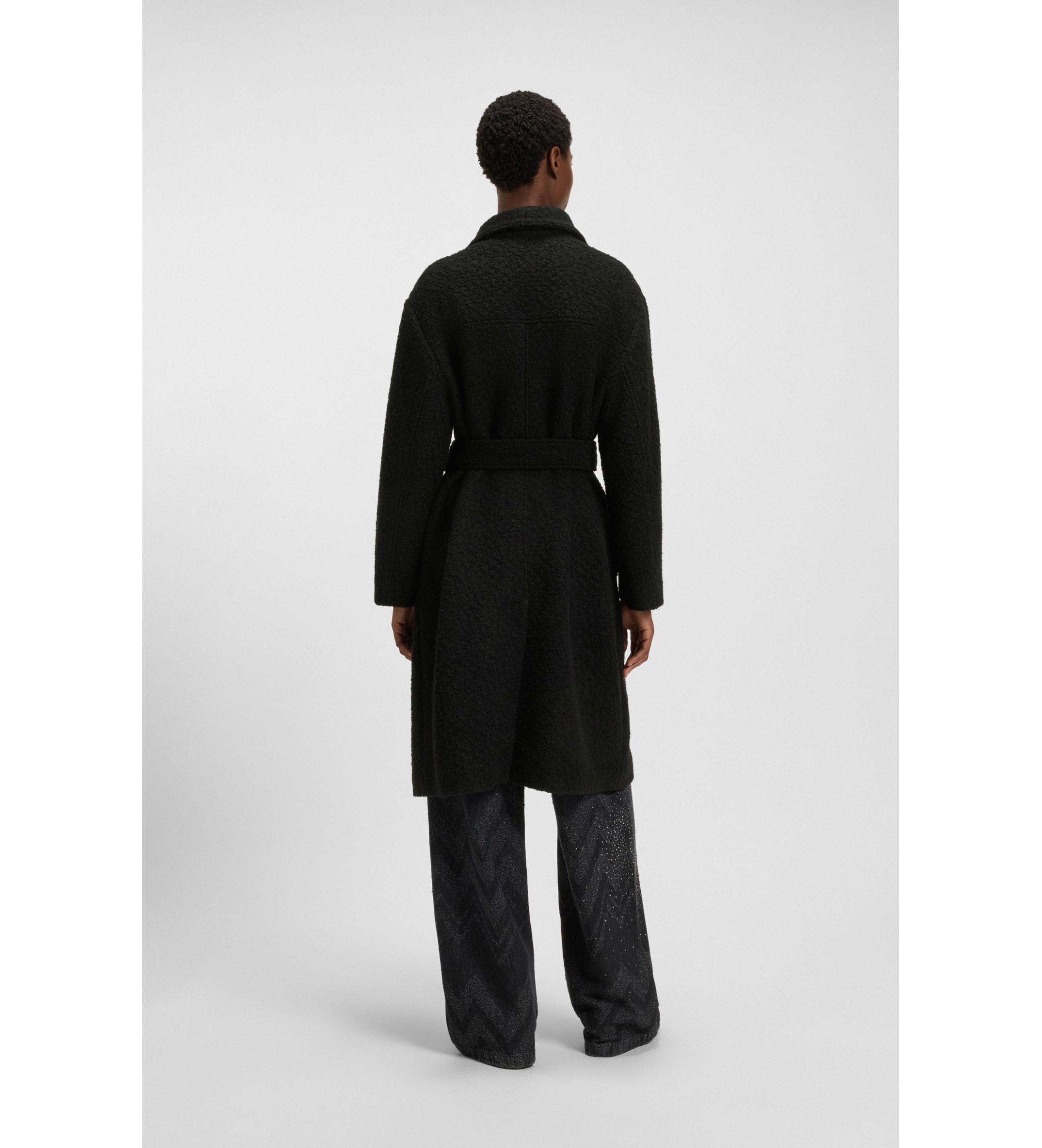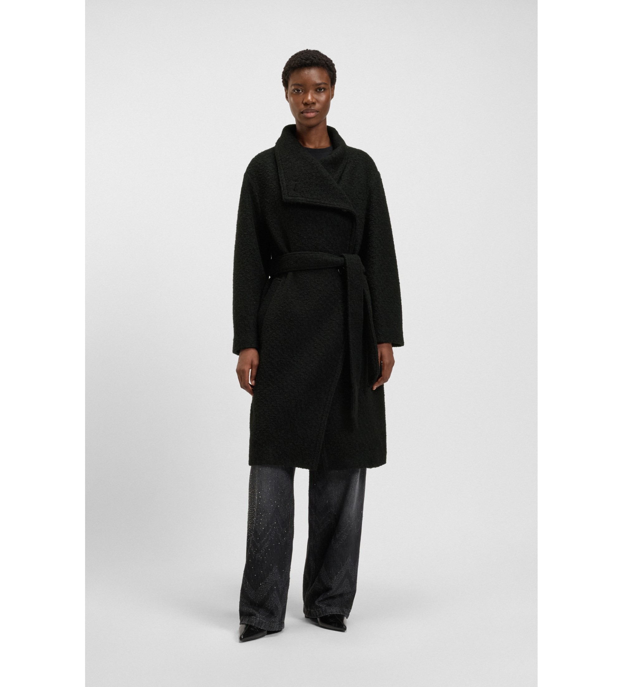 Ta sodoben plašč BOSS Womenswear iz volnene tkanine bouclé z mao ovratnikom je videti odlično odprt ali zaprt. Pas iz tkanine.
