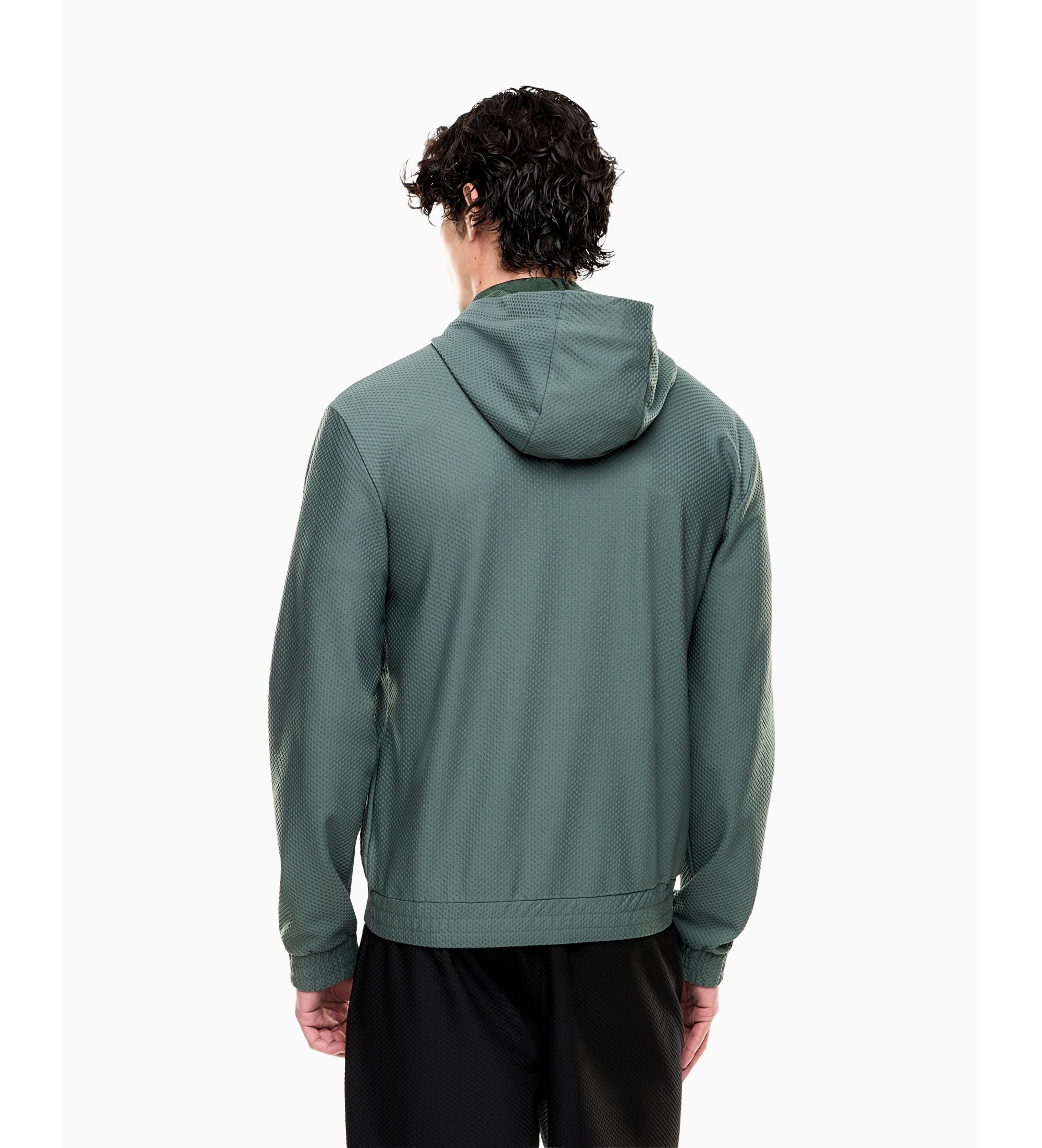 Jakna običajnega kroja, zasnovana za moške. Izdelana je iz raztegljivega žakarda s strukturo satovja (250 g/m˛), ki zagotavlja tehnično teksturo in kompakten občutek brez izgube elastičnosti. Prevladujoča barva je zelena (odtenek koriandra), njena glavna sestava - 82 % poliestra in 18 % elastana - pa zagotavlja udobje in dobro okrevanje. Športna, sodobna in dobro negovana ponudba za tiste, ki iščejo funkcionalnost in diskreten slog.