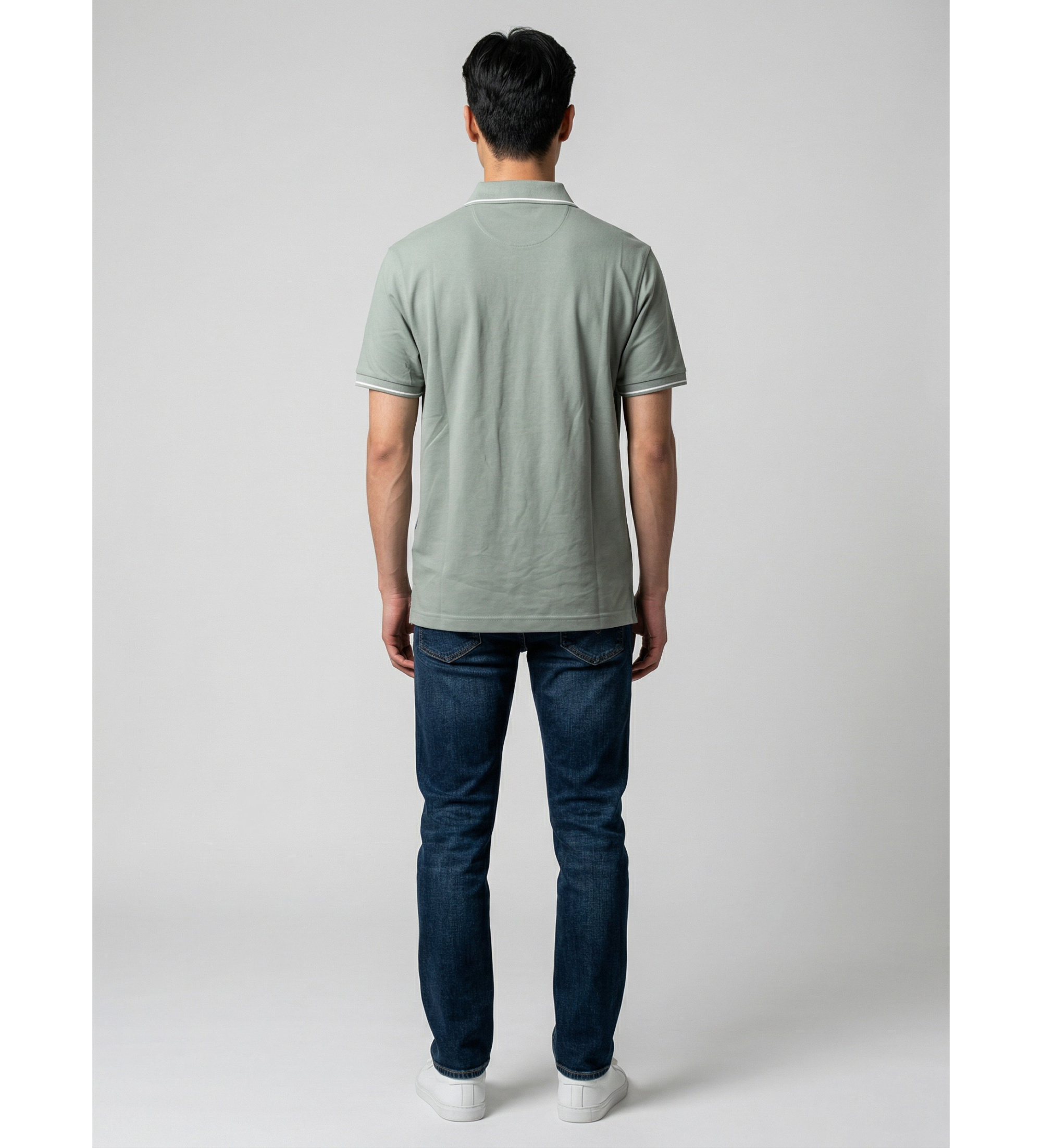 Moška polo majica ravnega kroja z ovratnikom, katerega kontrastna obroba se elegantno ujema z izrazitim detajlom na kratkih rokavih. Na prsih ima tudi izvezen napis blagovne znamke. Za fino pikčasto strukturo bombažnega džersija je značilna popolna zračnost in rahla raztegljivost. Izjemno mehek, vrhunski material zagotavlja visoko raven udobja. Vsestransko, priložnostno in elegantno oblačilo, idealno za vsakodnevno nošenje.