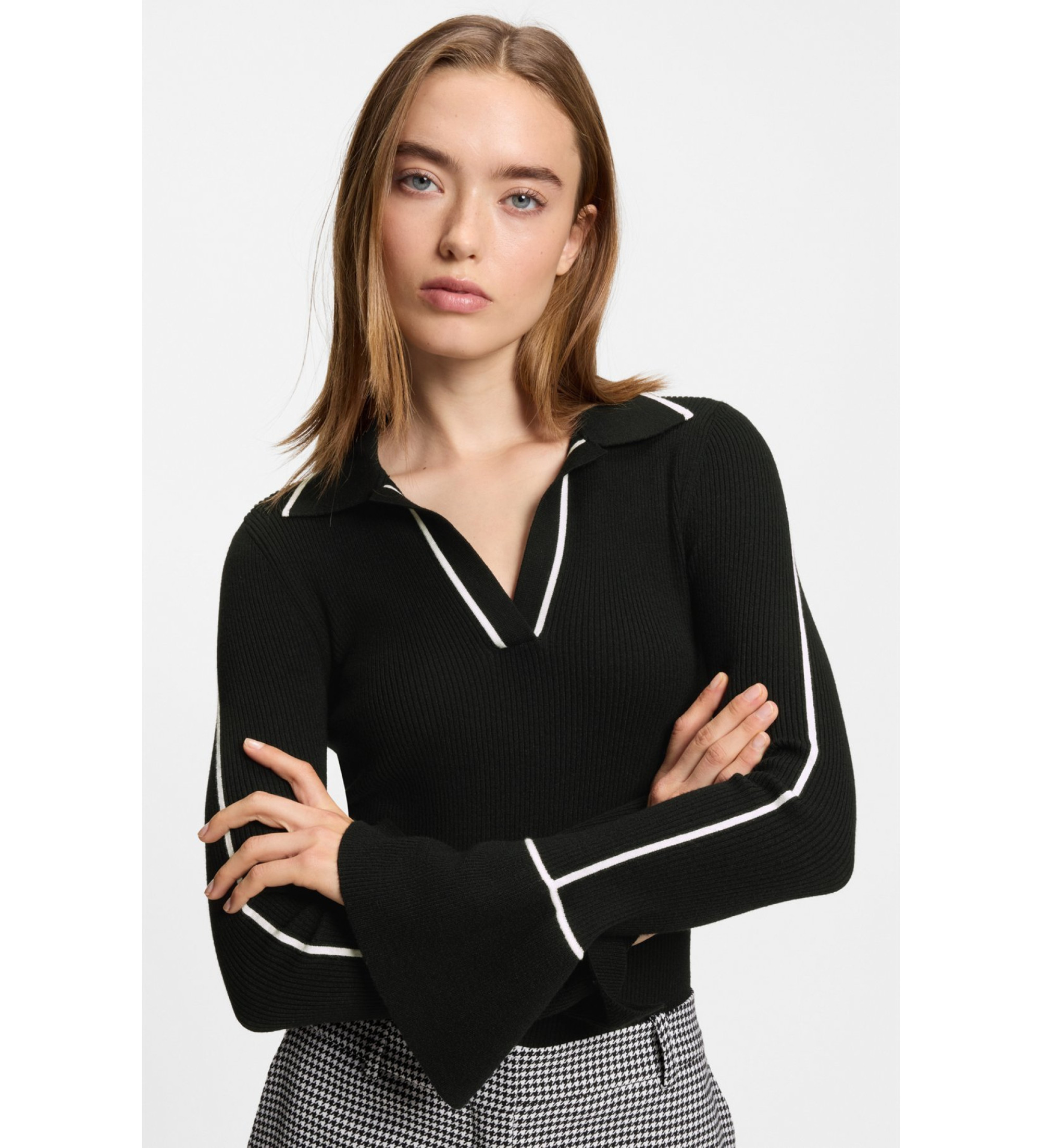 Ženski pulover HUGO z rebrastim vzorcem je ozkega kroja in ima visoke raztegnjene manšete za sodoben videz. Polo ovratnik. Kontrastne cevi. Vezen logotip.