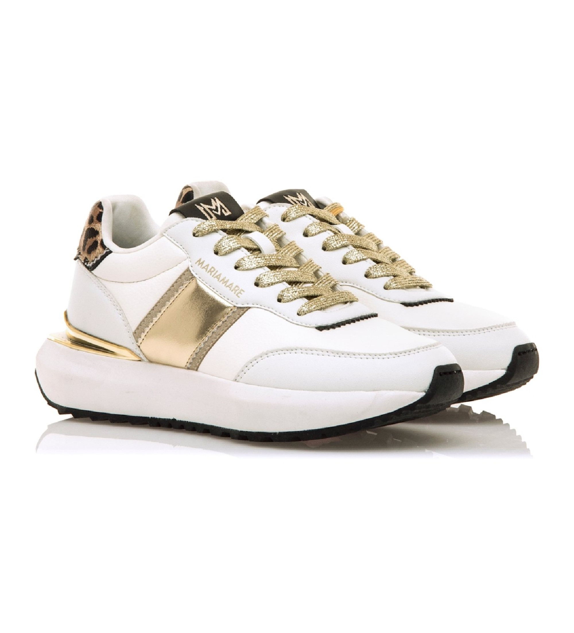 Elegantne in sodobne bele ženske superge znamke Mariamare, model Hoku. Te superge so sodobno oblikovane, z zlatimi kovinskimi detajli, ki krasijo stranice in peto, ter z živalskim potiskom na zadnji strani za vizualni kontrast. Zlato obarvane vezalke dopolnjujejo videz z atraktivnim pridihom na belem podplatu na platformi z nazobčano črno podlago, ki zagotavlja stabilnost in udobje na vsakem koraku. Idealno za kombiniranje s priložnostnimi oblačili, ki zahtevajo poseben pridih.