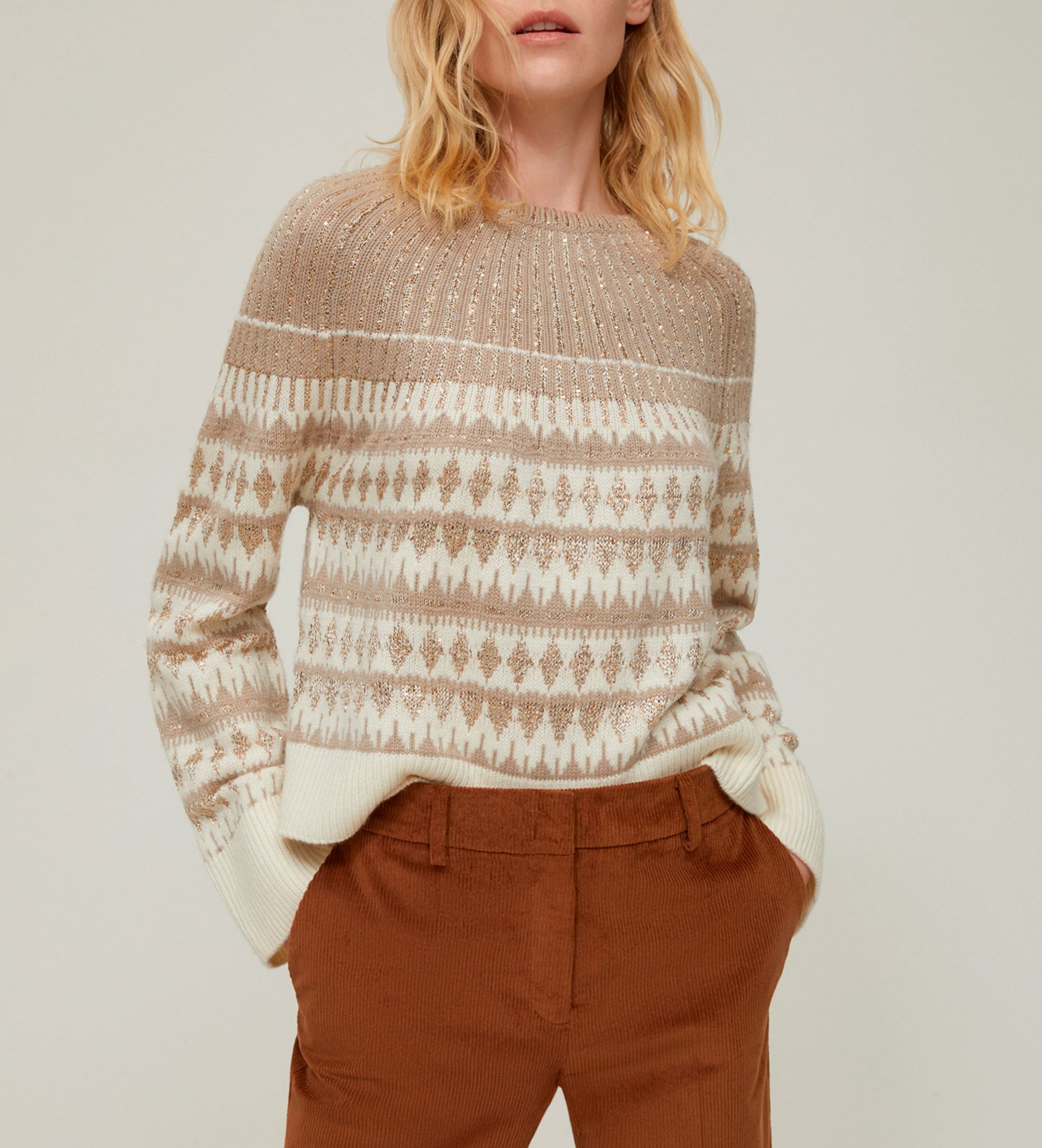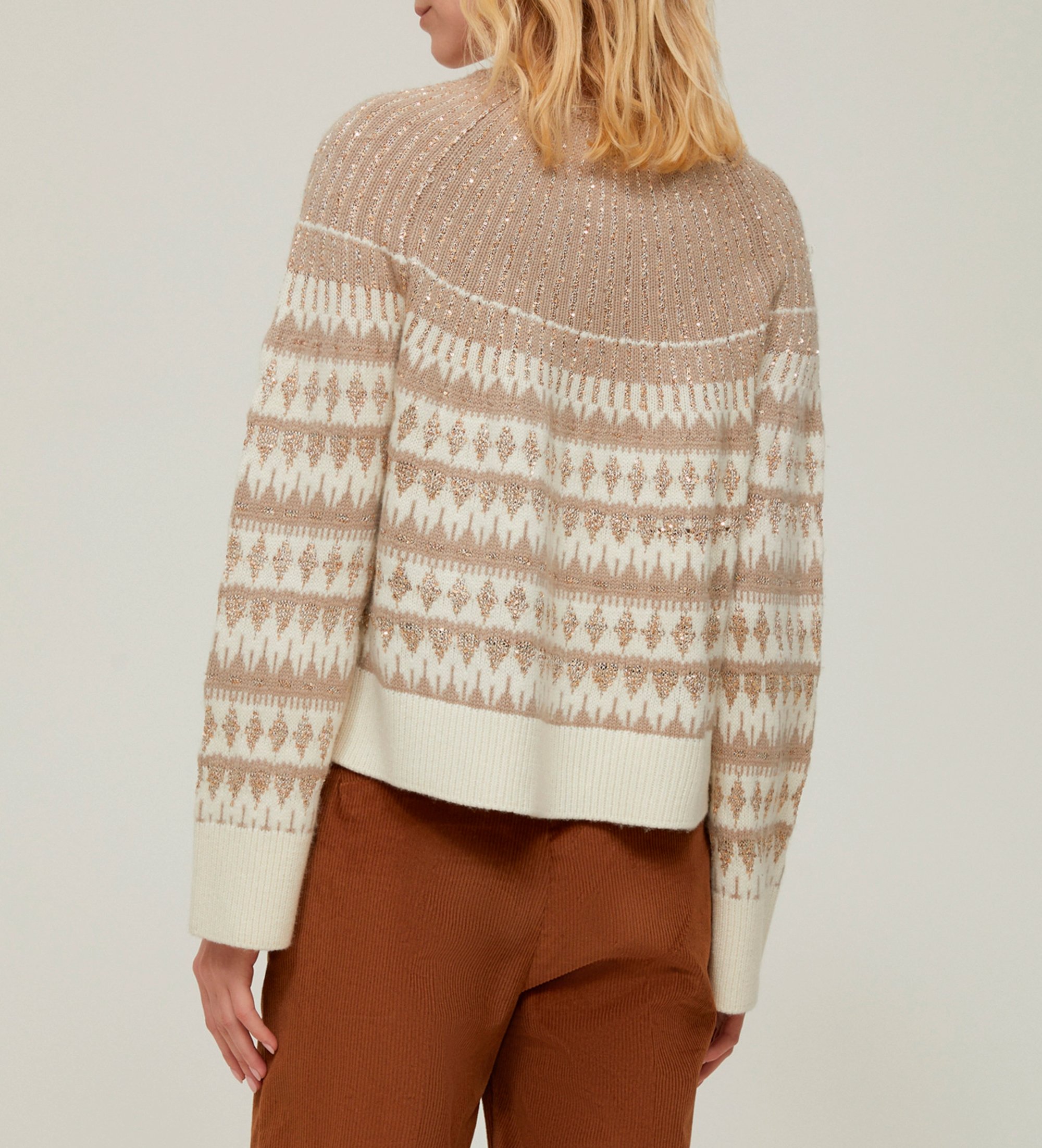Žakardno pleten pulover z geometrijskim vzorcem, ki ga je navdihnil čar nordijskega sloga. Detajli iz preje z bleščicami dodajo svetleč in prefinjen pridih, ki je kot nalašč za poživitev vsakega zimskega videza.