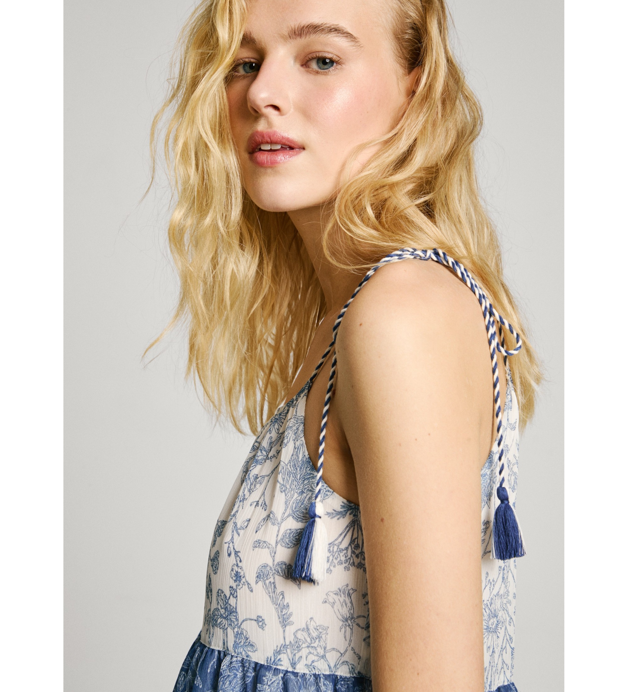 Odkrijte to dolgo obleko iz šifona, plapolajoč in romantičen kos, ki združuje boemsko eleganco s pridihom poletja. Njena večplastna zasnova v kontrastnih barvah in cvetlični potisk ustvarjata očarljiv vizualni učinek, ki je popoln za posebne priložnosti ali dneve na plaži. Zaradi ročno izdelanih detajlov na naramnicah in ploske silhuete je to edinstven kos, ki ga morate imeti v svoji sezonski garderobi.