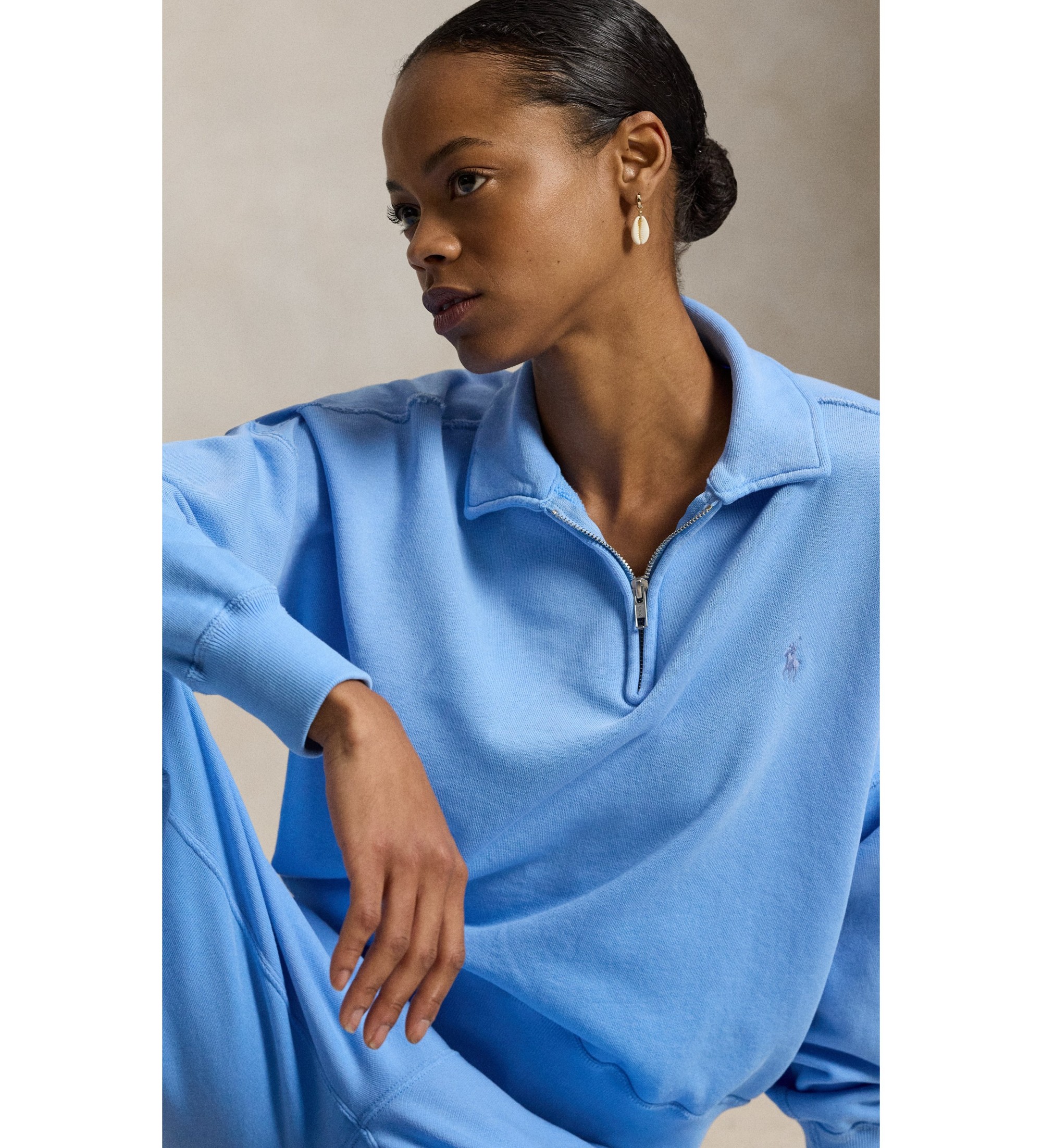 Ta kratka jopa z zadrgo je izdelana iz plišastega bombažnega frotirja z mehko, frotirju podobno pleteno notranjostjo in okrašena s podpisom konja na prsih.