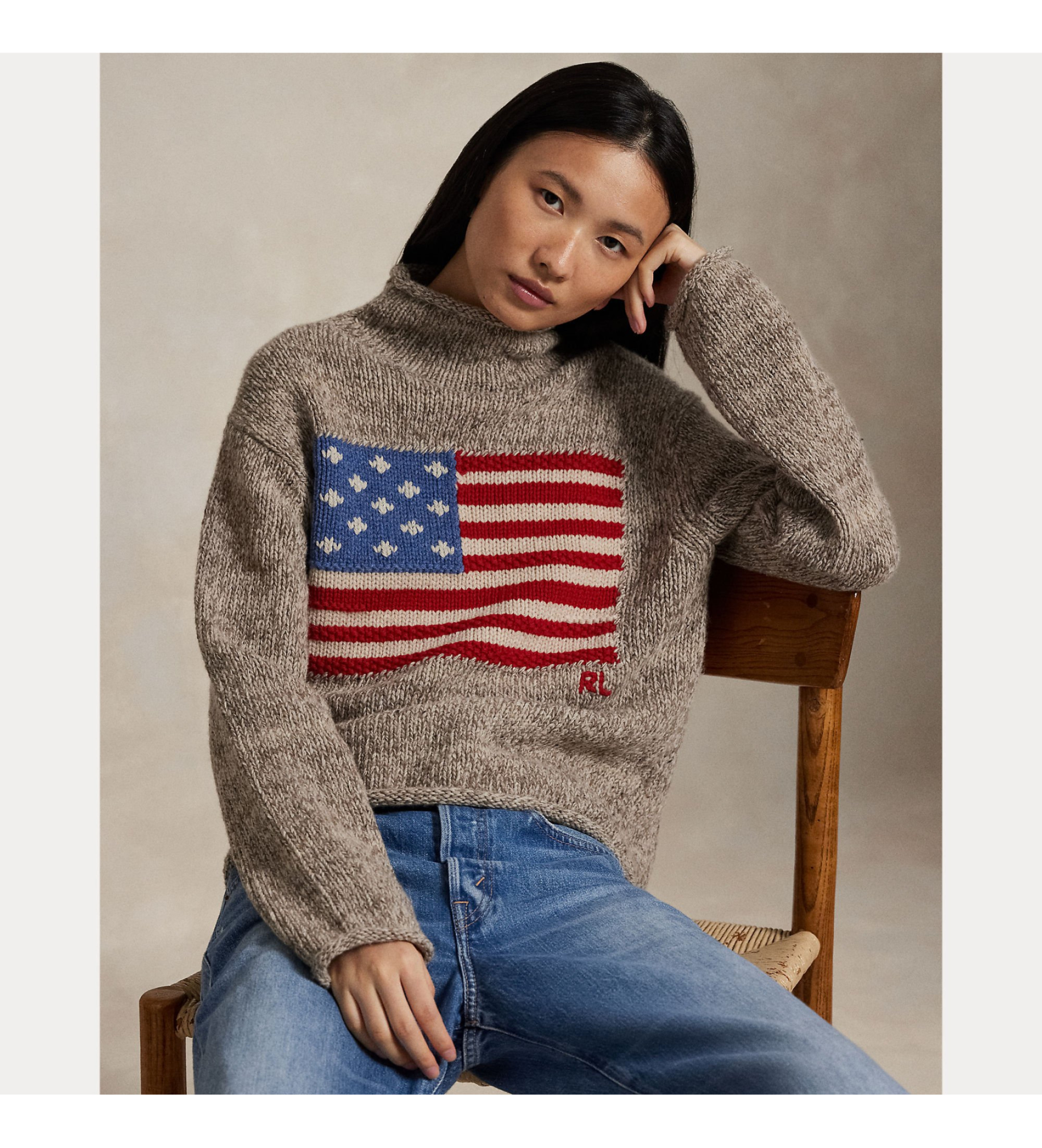 Ta različica kultnega puloverja Polo z zastavo ima zgodovinsko ameriško zastavo, pritrjeno z overlock šivom in okrašeno z ročno izvezenimi zvezdami. Marmorirana podlaga je izdelana iz težke volnene preje, ki ustvarja subtilno dimenzijo, in je zaključena z zavihanimi robovi. |