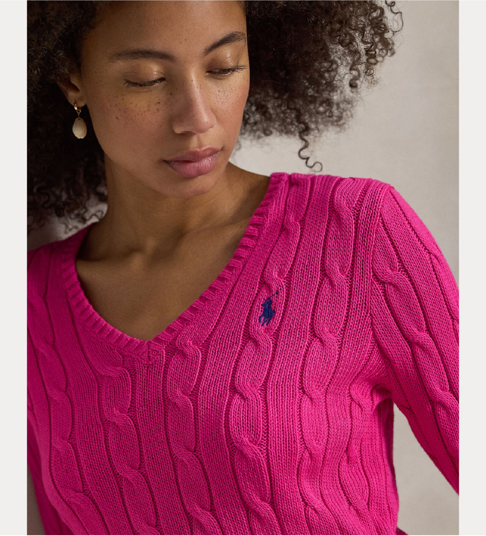 Ta klasični pulover z V-izrezom je izdelan iz česanega bombaža za mehak občutek, ima pleten vzorec in ozko krojeno silhueto. Na prsih je izvezen konj s podpisom, ki dodaja ikoničen zaključek.