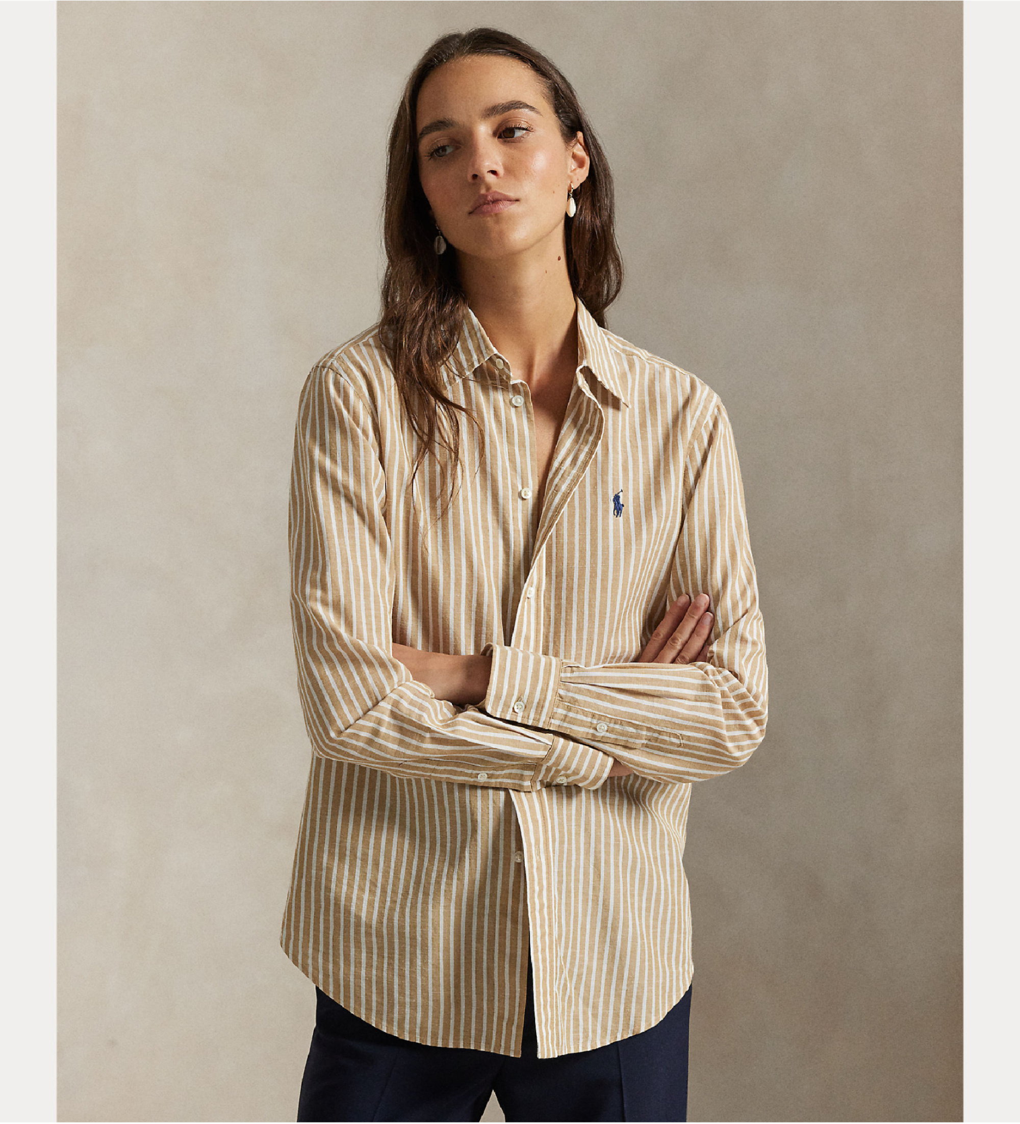 Ta srajca iz lanu in bombaža, izdelana v klasičnem kroju in slogu, ima črte, obarvane s prejo, na prsih pa je izvezen konj s podpisom hiše.