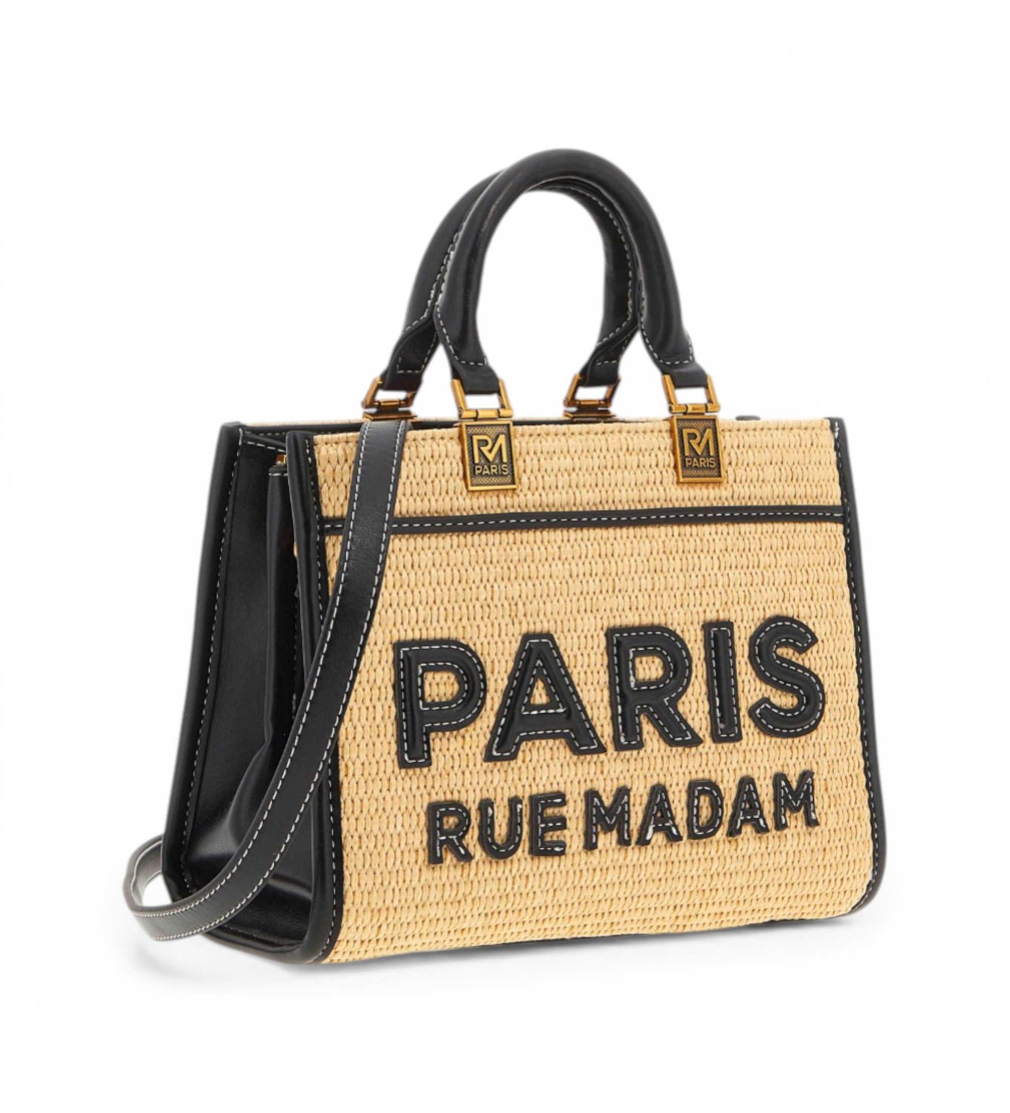 Mini slamnata torba z eko usnjem, stranicami in podrobnostmi, prešitim logotipom PARIS in kontrastnimi šivi. Ročaji iz eko usnja z detajlom kovinskega logotipa s starinskim zlatim galvaniziranjem, odstranljiv ramenski pas, osrednji žep na zadrgo iz eko usnja in bombažna podloga z notranjim žepom. Dimenzije: 23 cm dolga × 18 cm visoka × 10 cm globoka.