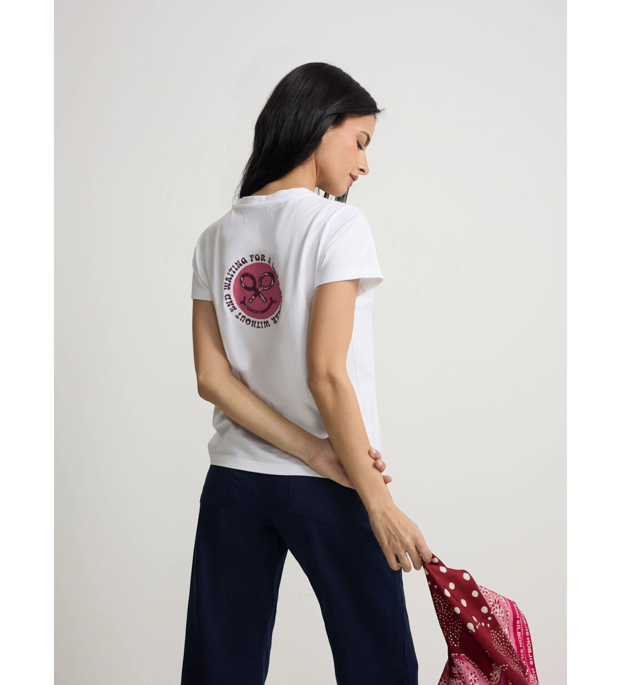 Majica iz čistega bombaža običajnega kroja z vezenino rakete na trupu in potiskom nasmeha na hrbtni strani. Priložnostni osebnostni kos, ki združuje ročno izdelane podrobnosti na sprednji strani z izrazitim grafičnim elementom na hrbtni strani in je ponosno izdelan na Portugalskem.
