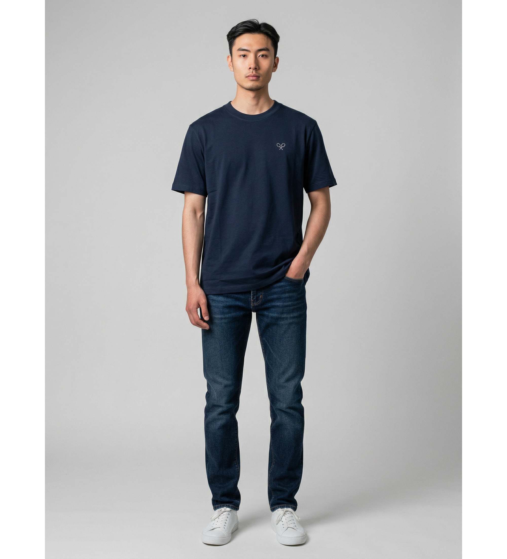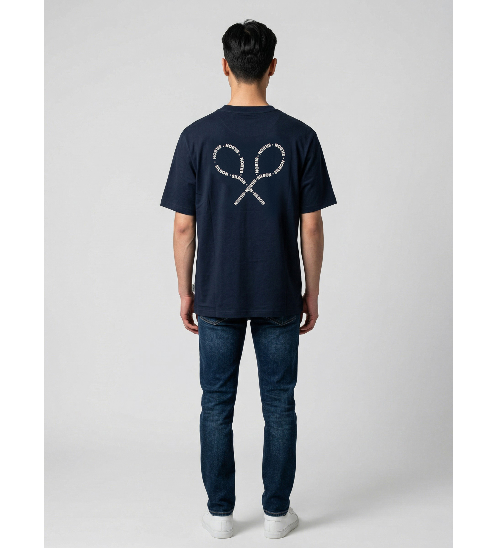 Majica s kratkimi rokavi osnovnega kroja iz navadnega pletenega materiala, ki pri blagovni znamki Silbon postane veliko več kot le osnovna majica. Čista, neomadeževana sprednja stran je v kontrastu z vizualno presenetljivo hrbtno stranjo: dve prekrižani lopatici, ki ju tvori ponavljajoča se tipografija znamke, ustvarjata domiselno in prepoznavno grafiko, zvesto Silbonovemu preppy-sportnemu univerzumu. Majhna vezenina prekrižanih raket na levi strani prsi dopolnjuje dizajn s pravo mero diskretnosti.